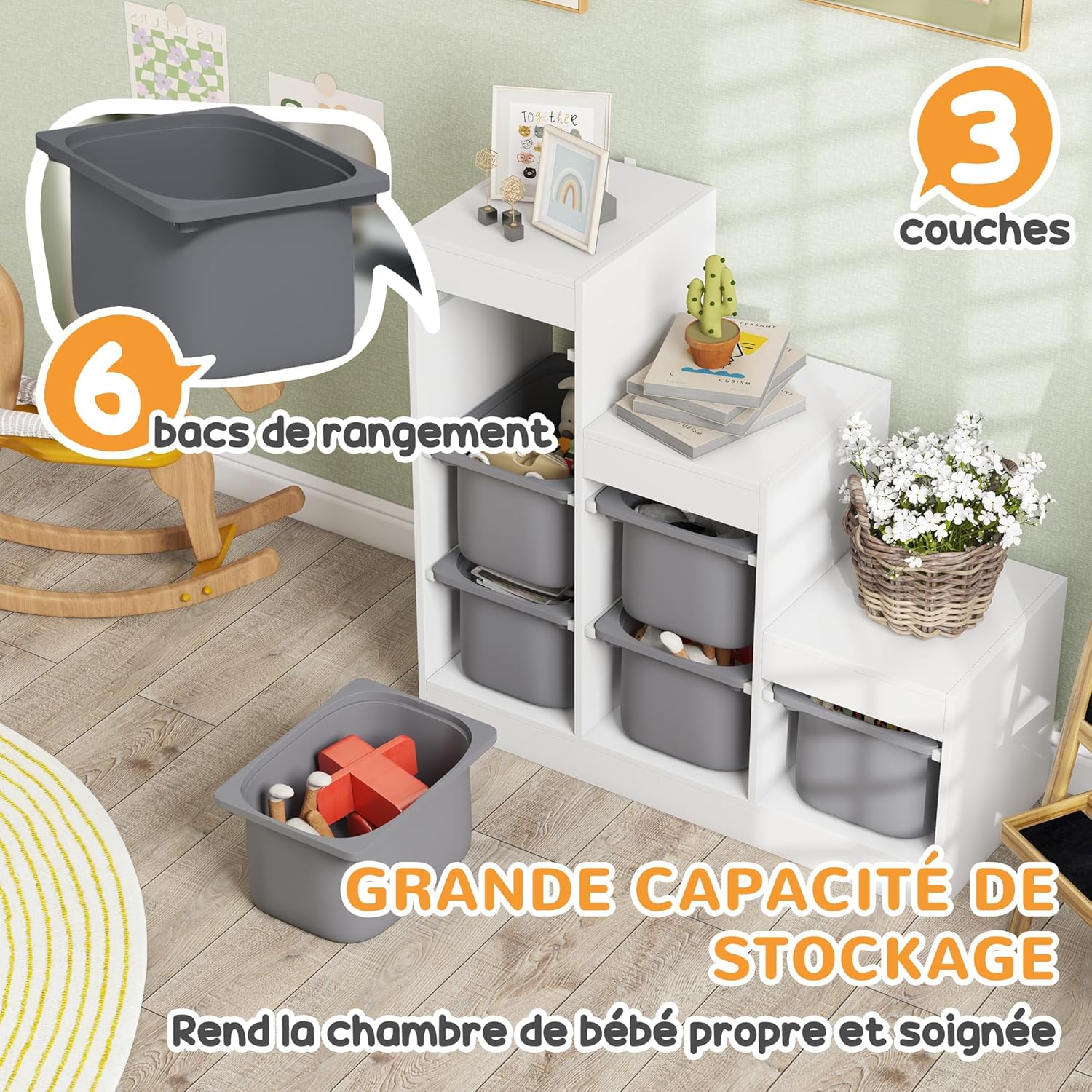 ESPACE JEU ORGANISÉ : Doté de 6 bacs amovibles, ce meuble de rangement pour jouets simplifie le stockage et l’organisation de petits objets comme les blocs de construction, les crayons et les camions jouets. Ranger devient un vrai jeu d’enfant !