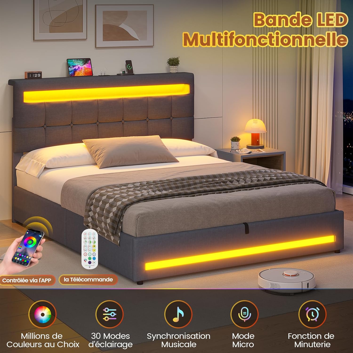 【Bande LED Polyvalente】Équipe de bandes LED RGB à la tête et au pied du lit, ce lit en lin gris foncé vous permet de régler à votre guise la couleur, la luminosité, la fonction de minuterie et la synchronisation musicale via l’APP et la télécommande lorsque vous vous y allongez, ajoutant une touche technologique et romantique à votre chambre