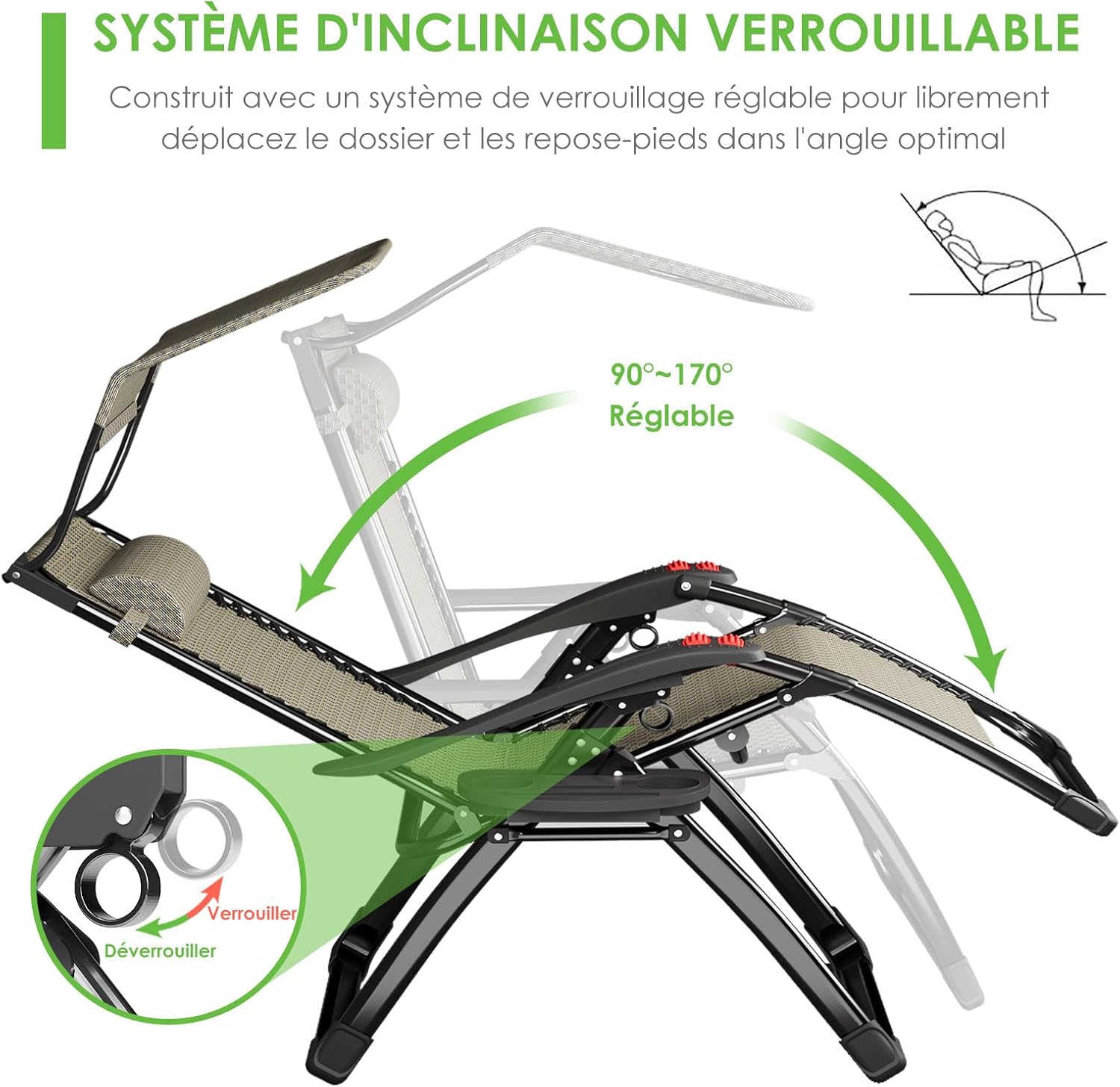 【Facile à transporter et confortable à utiliser】Ce transat de gazon pliable n’a pas besoin d’assemblage et peut être facilement déployé et replié en quelques secondes. Pourvu d’un verrou, ce fauteuil en position null-G vous permet de régler facilement l’angle de repos de 0° à 170°, afin que vous puissiez vous détendre et vous abandonner à une expérience apaisante