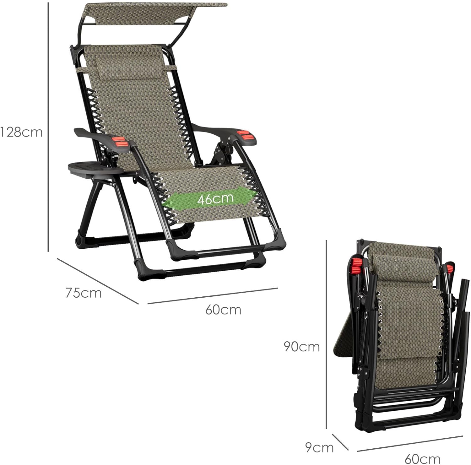 【Fauteuil adaptatif avec parasol】Ce fauteuil en position null-G avec parasol réglable offre une relaxation maximale et une protection complète contre les rayons du soleil tout au long de la journée. Le système de réglage du fauteuil permet d’ajuster facilement le dossier et de le fixer à l’angle souhaité. La surface, munie de sangles élastiques, s’adapte mieux à votre silhouette et offre une soutien suffisant