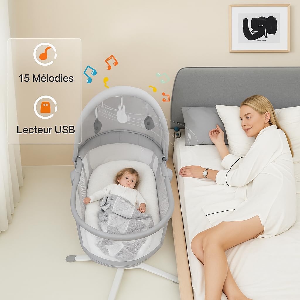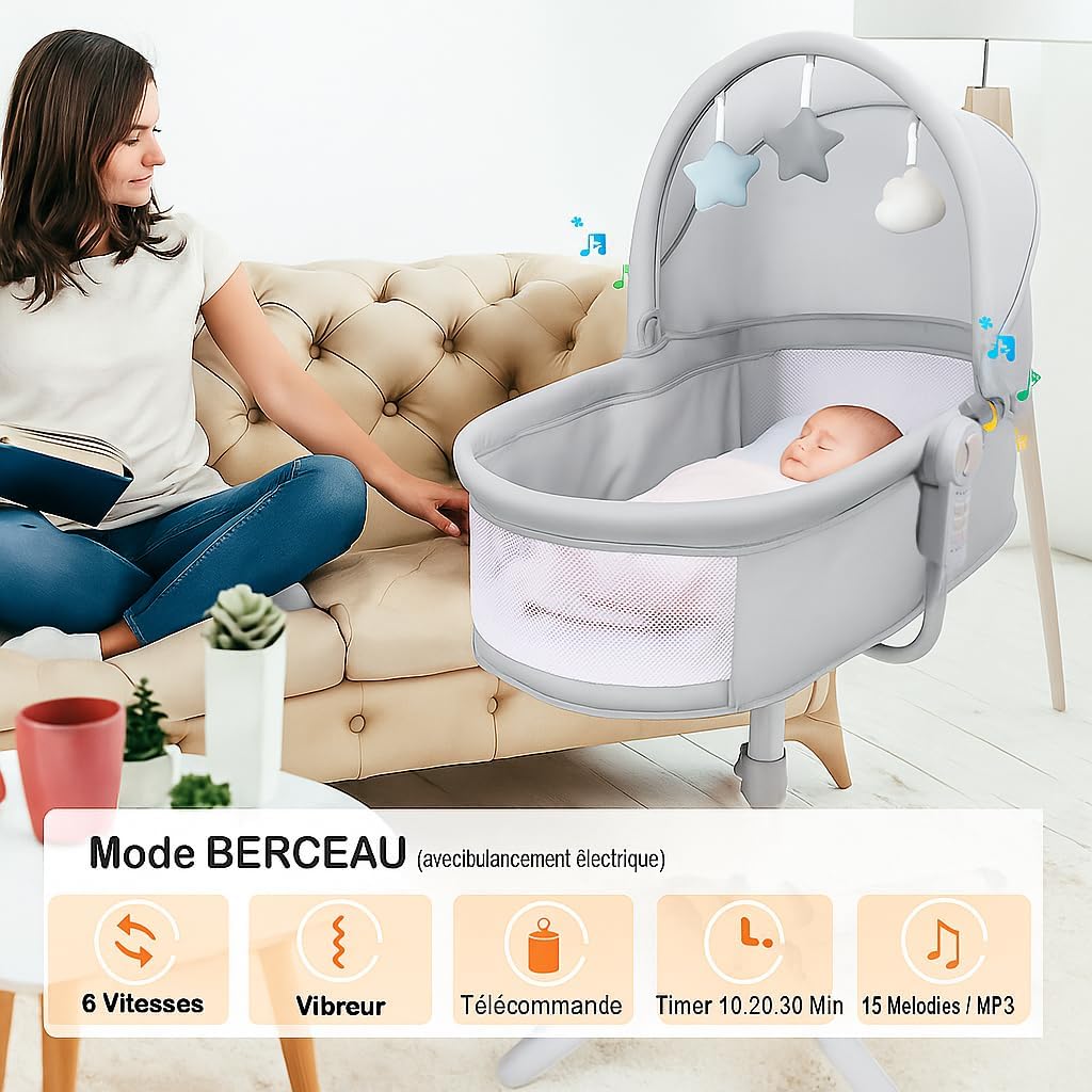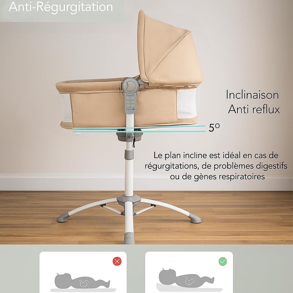 Une circulation d’air optimale.Un réducteur matelassé tout doux.Une capuche, balancement électrique.Une arche avec 3 peluches toutes douces.
