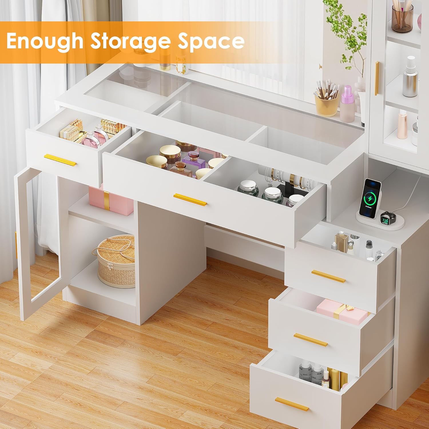【STATION DE CHARGE INTÉGRÉE】Cette coiffeuse moderne est dotée de 2 prises standard et de 2 ports USB, vous permettant d’utiliser facilement votre sèche-cheveux ou votre fer à friser tout en vous maquillant, ainsi que de recharger votre téléphone, votre tablette ou tout autre appareil électronique