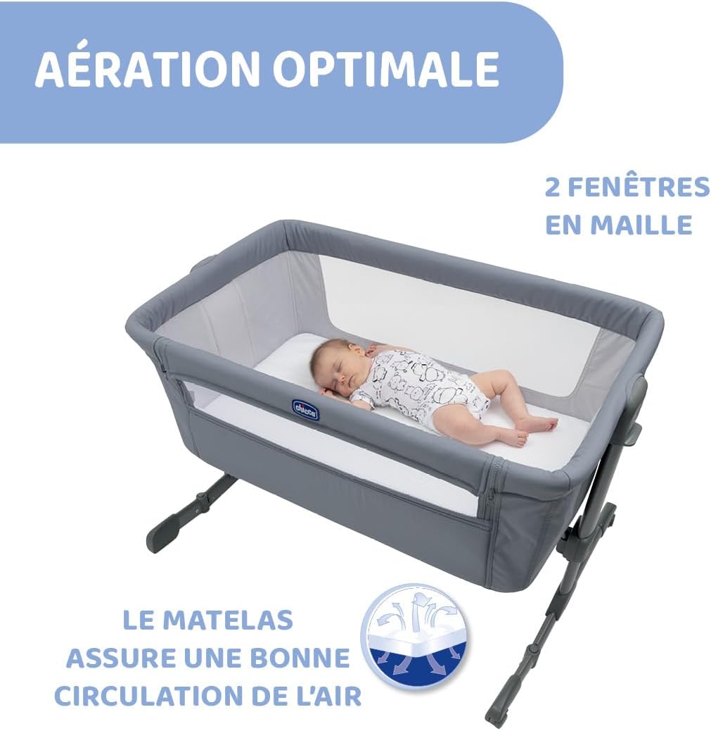 Chicco Next2Me Essential est la berceau cododo de Chicco conçu pour garder bébé près de vous pendant la nuit et vous permettre de gérer facilement les réveils nocturnes. Grâce aux sangles fournies, le berceau peut être facilement fixé au lit. La hauteur est réglable (il y a 6 niveaux de hauteur différents) et les pieds se replient. Deux côtés du berceau sont en filet pour assurer une circulation d’air optimale et permettre aux parents de voir le bébé à tout moment. Le berceau peut être facilement incliné pour un confort optimal du bébé, pendant la digestion ou en cas de nez bouché. L’ensemble comprend un sac de voyage, un matelas respirant et un kit de fixation du berceau au lit. C’est également un choix éco-responsable puisque 62 % de ses tissus sont fabriqués à partir de polyester recyclé.