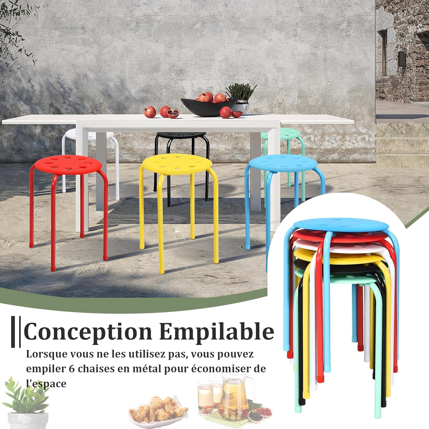【Design empilable pour un rangement facile :】 Ce lot de 6 tabourets empilables en métal est léger pour être soulevé verticalement, ou stocké ensemble de manière empilable pour un rangement facile pour économiser de l’espace lorsqu’il n’est pas utilisé. Les bords arrondis facilitent le levage et facilitent la séparation des uns des autres pour une assise confortable.