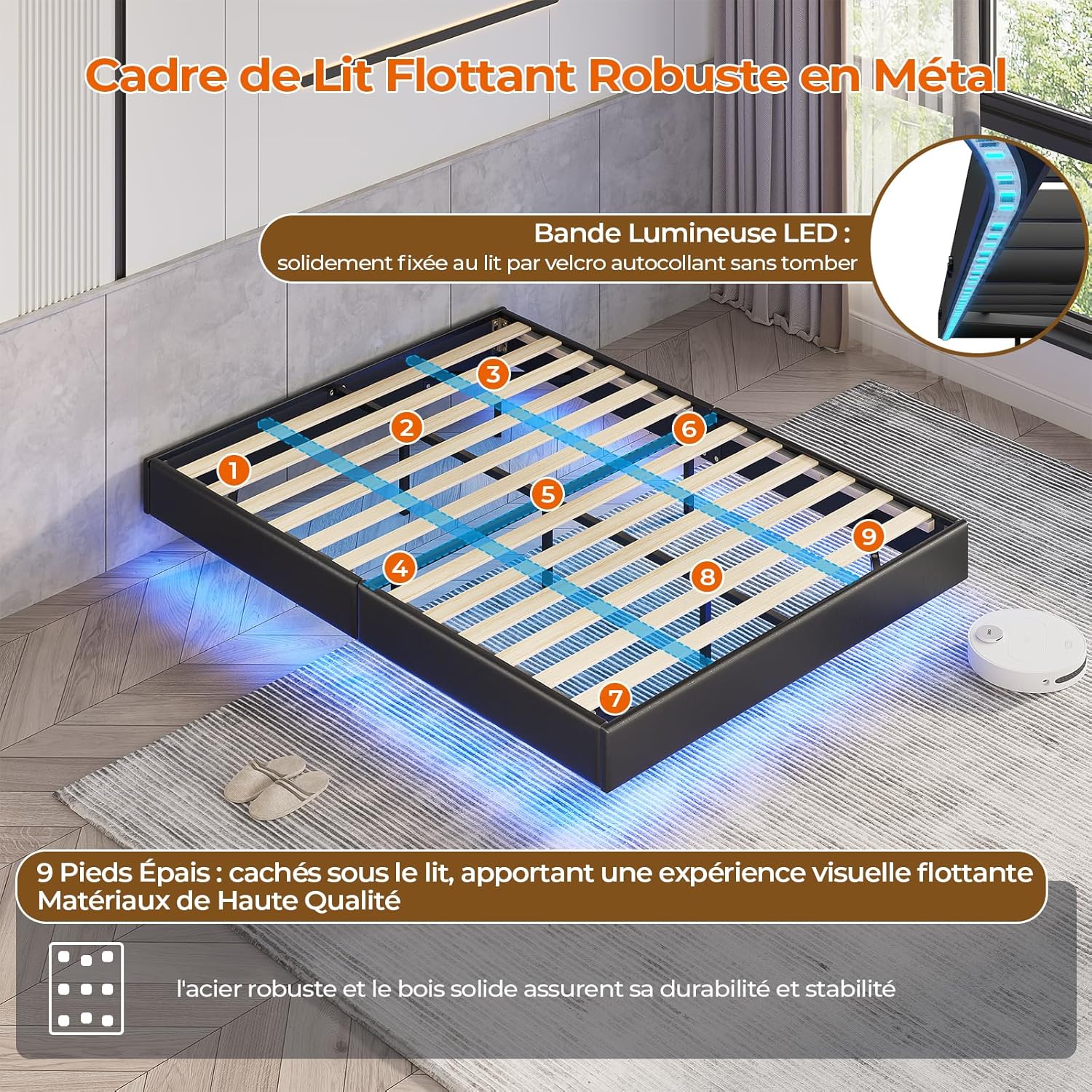 Lit 140x190cm Design Flottant avec Éclairage LED