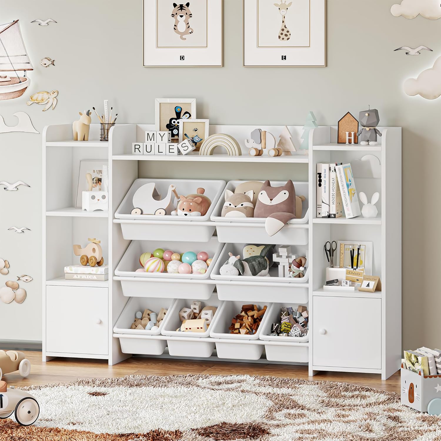 [Créez une pièce bien rangée] : Le meuble de rangement jouets pour enfants blanche comprend 8 coffres à jouets, 4 étagère ouvertes et 2 étagères avec portes, suffisamment d’espace pour ranger diverses nécessités quotidiennes et garder la pièce propre et bien rangée.