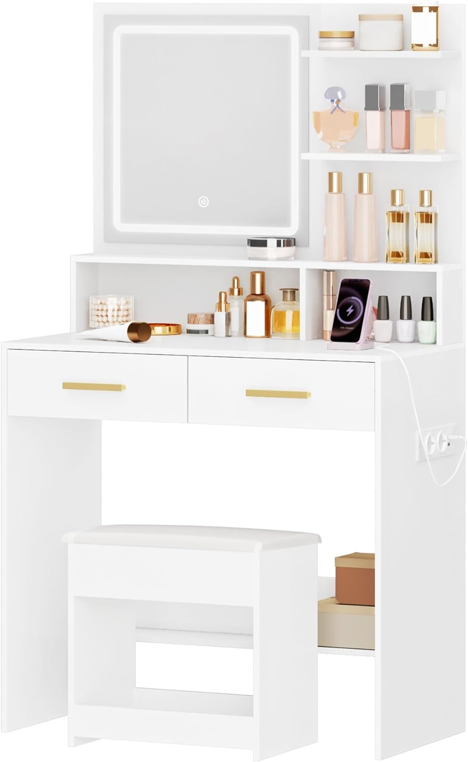 【Prise de Chargement 】La coiffeuse est équipée d’une alimentation électrique (2 prises et 2 ports USB), ce qui est pratique pour charger votre téléphone portable ou brancher des appareils de beauté tels que le sèche-cheveux. Ce design vous permet de réaliser la combinaison parfaite avec la technologie pendant que vous vous maquillez.