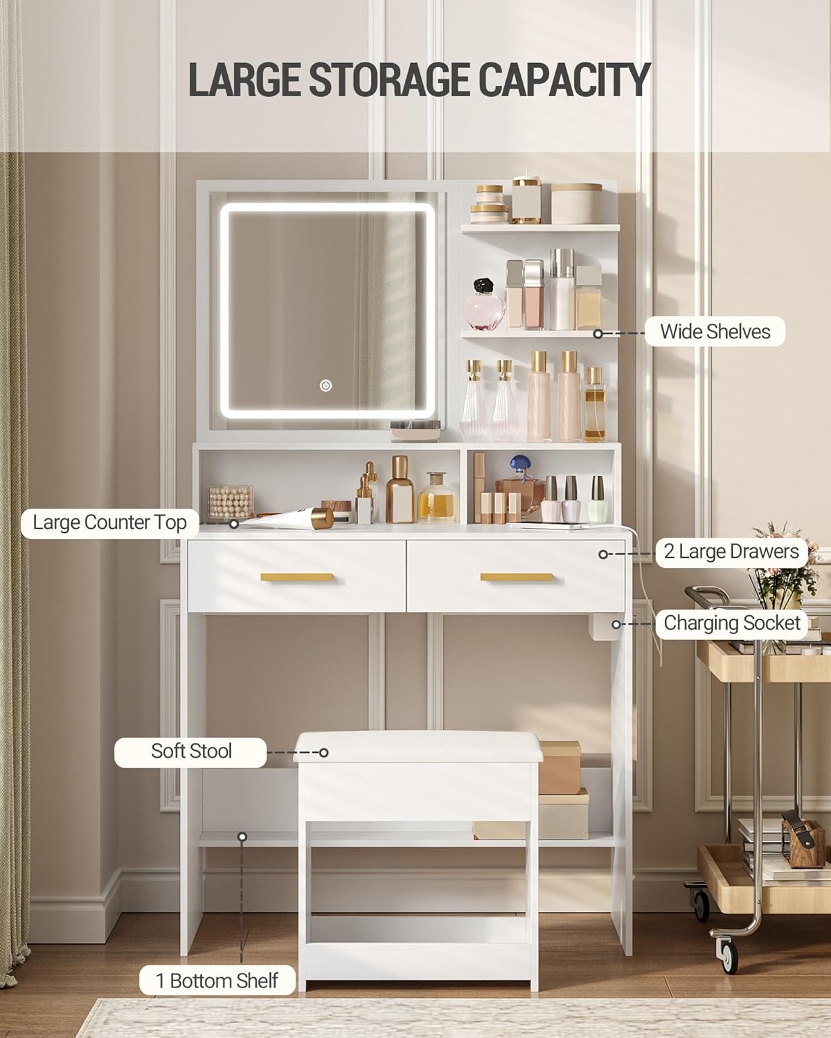 【Tabouret Souple et Confortable】Cette coiffeuse est également livrée avec un tabouret de maquillage souple. Vous pouvez vous y asseoir confortablement, ce qui vous permet de profiter d’un confort optimal pendant le maquillage. Un espace de rangement est également prévu sous le tabouret ! Vous pouvez y ranger les petits objets que vous n’utilisez pas souvent, ce qui est à la fois pratique et peu encombrant.