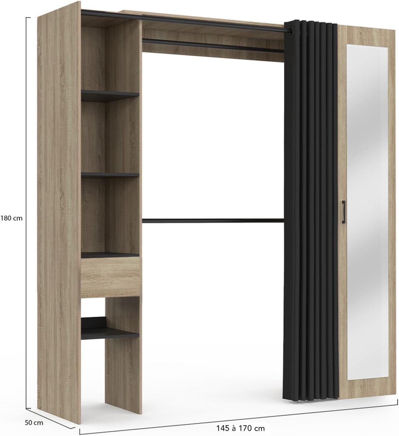 Aménagez votre chambre à coucher ou dressing avec ce dressing MADISON coloris bois et noir, moderne et fonctionnel. Grâce à ses dimensions réglables de 145 à 170 cm, vous pourrez intégrer facilement ce dressing dans votre intérieur en l’adaptant à la dimension souhaitée. Selon vos besoins, il vous suffira de découper les barres de penderie pour répondre à la longueur souhaitée. Doté d’une barre de penderie sur 2 niveaux, le dressing MADISON vous permet de suspendre un grand nombre de vêtements : robes, vestes, chemises ou encore manteaux et de les garder ainsi à portée de main.Équipé également de 7 étagères dont 4 réglables (2 par colonne), ce dressing vous permettra de ranger facilement vos pulls, pantalons ou encore vos sacs à main de manière ordonnée. Sa porte de placard, vous permet de ranger discrètement vos affaires grâce aux 3 étagères qui s’y cache derrière. Le miroir sur cette porte est parfait pour valider votre look du jour avant de partir ! Profitez également d’un tiroir sur la colonne de gauche pour vous permettre d’y ranger vos sous-vêtements ou tous les autres objets personnels.Ce dressing est donc le partenaire idéal pour une organisation vestimentaire optimale dans n’importe quel espace. De plus, celui-ci est également équipé d’un rideau noir qui, une fois fermé, vous permet de garder l’ensemble de vos affaires à l’abri des regards indiscrets et de conserver un espace ordonné. Le dressing MADISON, au coloris bois et noir, se mariera parfaitement avec votre décoration et ajoutera une touche de sobriété et de modernité à votre intérieur. Alors n’hésitez plus et laissez-vous séduire par le mélange parfait de fonctionnalité et d’élégance avec ce dressing extensible MADISON hêtre et noir.Dimensions du dressing MADISON bois et noirDimensions globales : Longueur 145/170 cm x largeur 50 cm x Hauteur 180 cmDimensions du tiroir : L. 27,5 x P. 32,5 x H. 13 cmDimensions étagères colonne gauche : L. 32,5 x