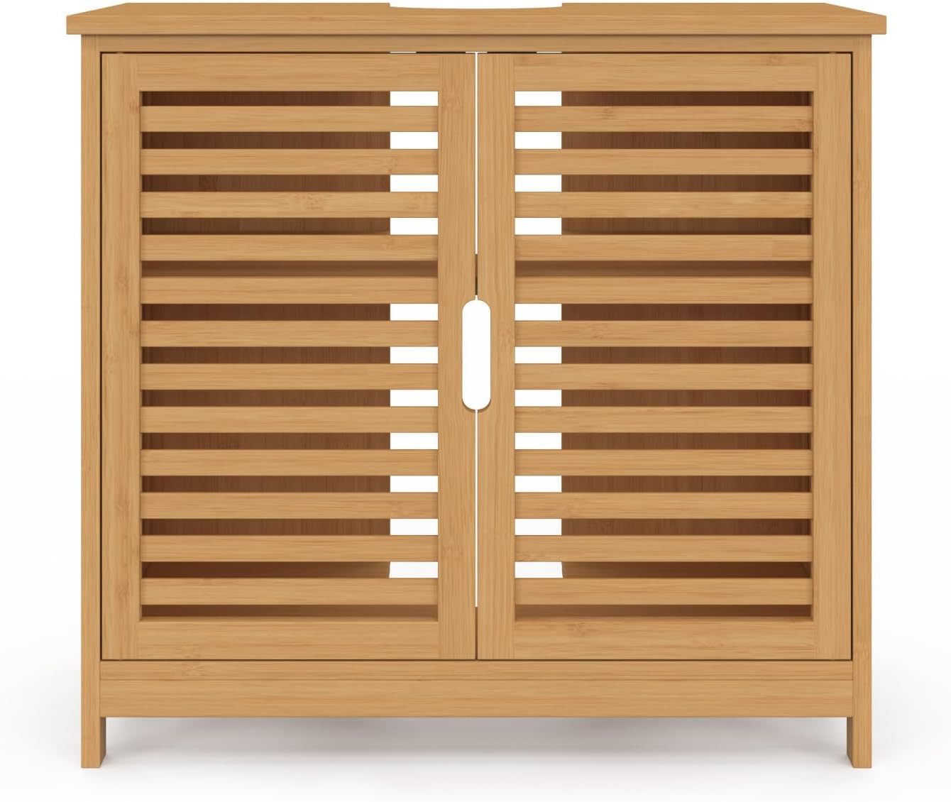 Optez pour la facilité avec le meuble sous lavabo BEA en bambou et gagnez de l’espace de rangement dans votre salle de bain !Son placard spacieux à portes battantes offre un espace de rangement fermé pour garder une salle de bain organisée.À l’intérieur, se trouve une étagère repositionnable, parfaite pour y stocker vos serviettes de bain ainsi que vos produits de toilettes.La matière en bambou naturel de ce meuble sous lavabo BEA vous permet de l’associer facilement à tous types de salle de bain.Ses portes sont légèrement ajourées pour apporter une touche de style et d’élégance.Son format standard L60 x l30 x H65 cm s’adapte à la plupart des lavabos, vous offrant un réel gain de place tout en conservant un meuble compact. N’attendez plus et craquez pour notre meuble sous lavabo BEA en bambou naturel ! Dimensions du meuble BEA en bambou naturel : Dimensions totales : Longueur 60 cm x largeur 30 cm x Hauteur 65 cm Hauteur des pieds : 6 cmDimensions maximum pour la colonne de lavabo : L. 20 x l. 15 cmMatériaux : Bambou naturel + MDF Coloris : Bambou A monter soi-même Visserie incluseRetrouvez l’ensemble de notre nos meubles de salle de bain sur notre boutique en ligne.
