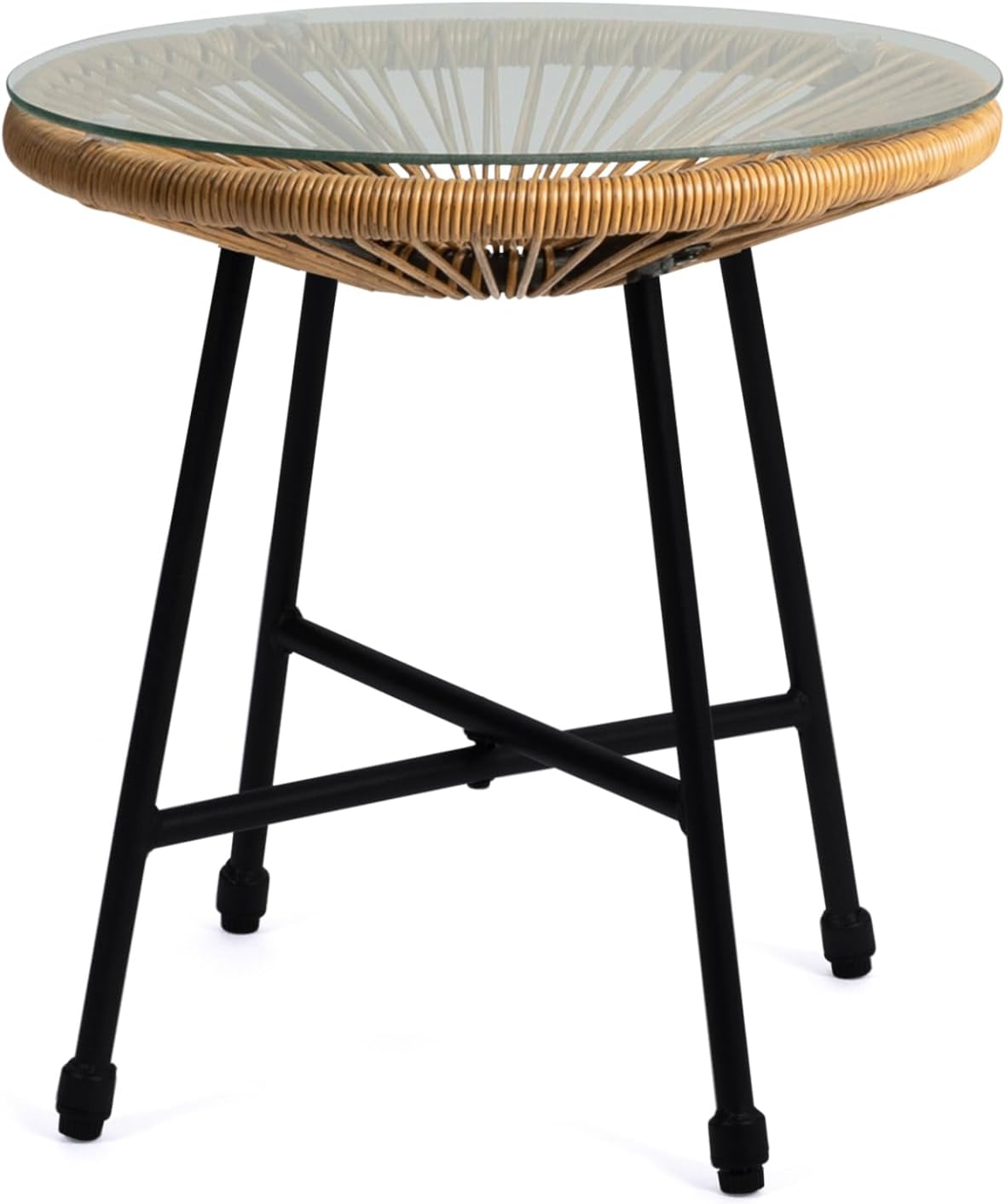 Lot de 2 fauteuils imitation rotin style œuf et leur table basse avec plateau en verre trempé