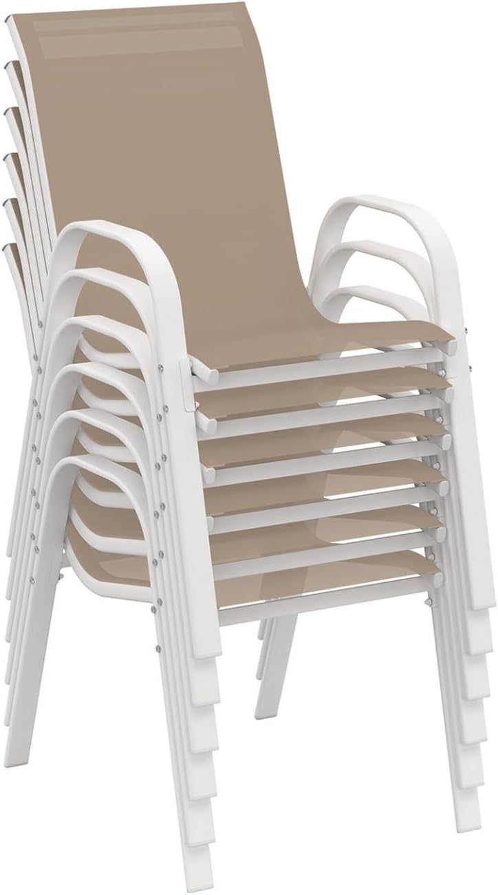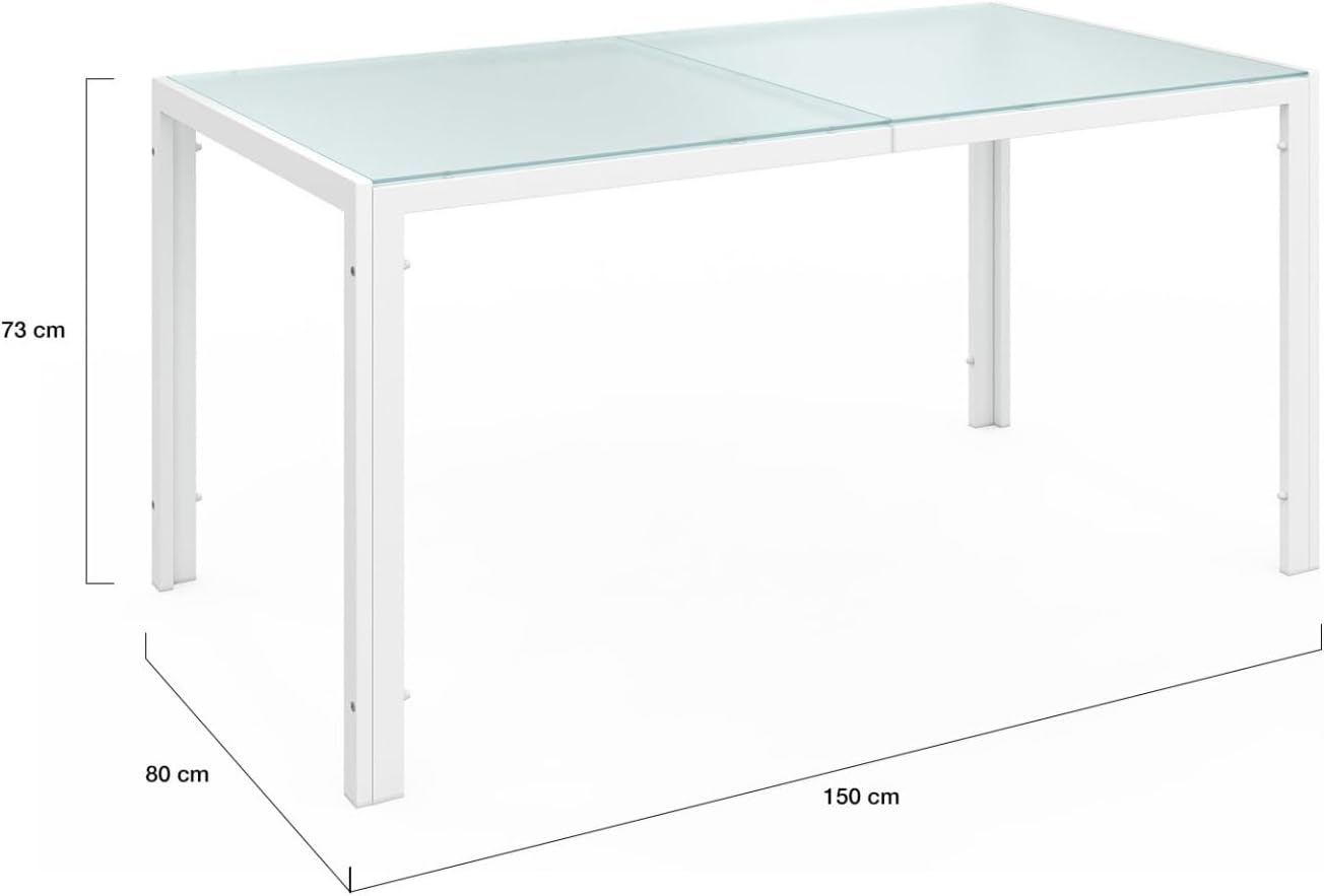 Réunissez amis et famille autour de ce salon de jardin MADRID ! Avec sa capacité d’accueil de 6 personnes, profitez de moments chaleureux à plusieurs et échangez en toute convivialité ! Grâce à ses 6 chaises empilables, cet ensemble de jardin propose ergonomie et facilité d’installation. Sa structure en acier, pensée pour les repas en extérieur, lui confère robustesse et longévité.Le coloris blanc associé au coloris beige des assises confère à ce salon un look tendance et moderne qui s’intègrera parfaitement à votre extérieur !Composé d’un plateau de table en verre trempé transparent, le salon MADRID apporte modernité et design dans votre jardin ou sur votre terrasse. La structure en acier ainsi que le dossier et l’assise des chaises en textilène facilitent l’entretien de cet ensemble table et chaises de jardin.De plus, si vous souhaitez protéger votre salon de jardin, installez une housse pour chaises de jardin ainsi qu’une housse pour table de jardin.Profitez des beaux jours grâce au salon de jardin MADRID et usez de son ergonomie pour partager en famille ou entre amis des moments de bien-être ! Dimensions du salon de jardin MADRID blanc et beige 6 placesEnsemble composé d’une table et de 6 chaises empilablesDimensions de la table : Longueur 150 cm x largeur 80 cm x Hauteur 73 cmStructure de la table et des chaises : acierPlateau de table en verre trempé : 5 mmDimensions d’une chaise : Longueur 51,5 cm x largeur 68 cm x Hauteur 84 cmMatière du dossier et de l’assise : textilèneColoris : Beige structure blancheÀ monter soi-mêmeDécouvrez également tous nos salons de jardin sur notre boutique en ligne !