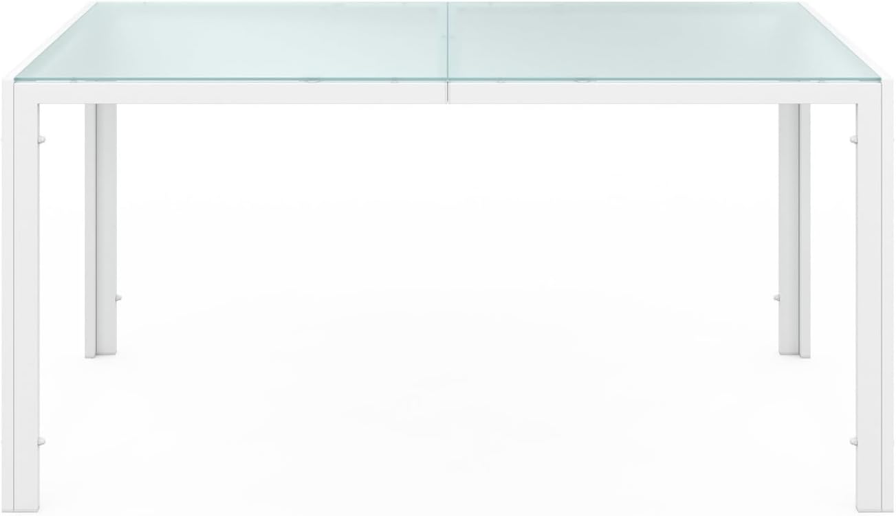 Composé d’un plateau de table en verre trempé et d’une structure blanche