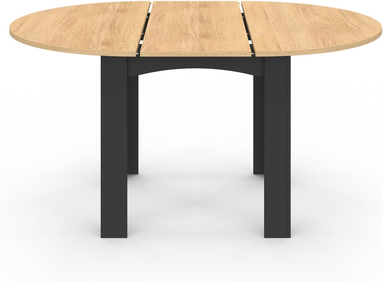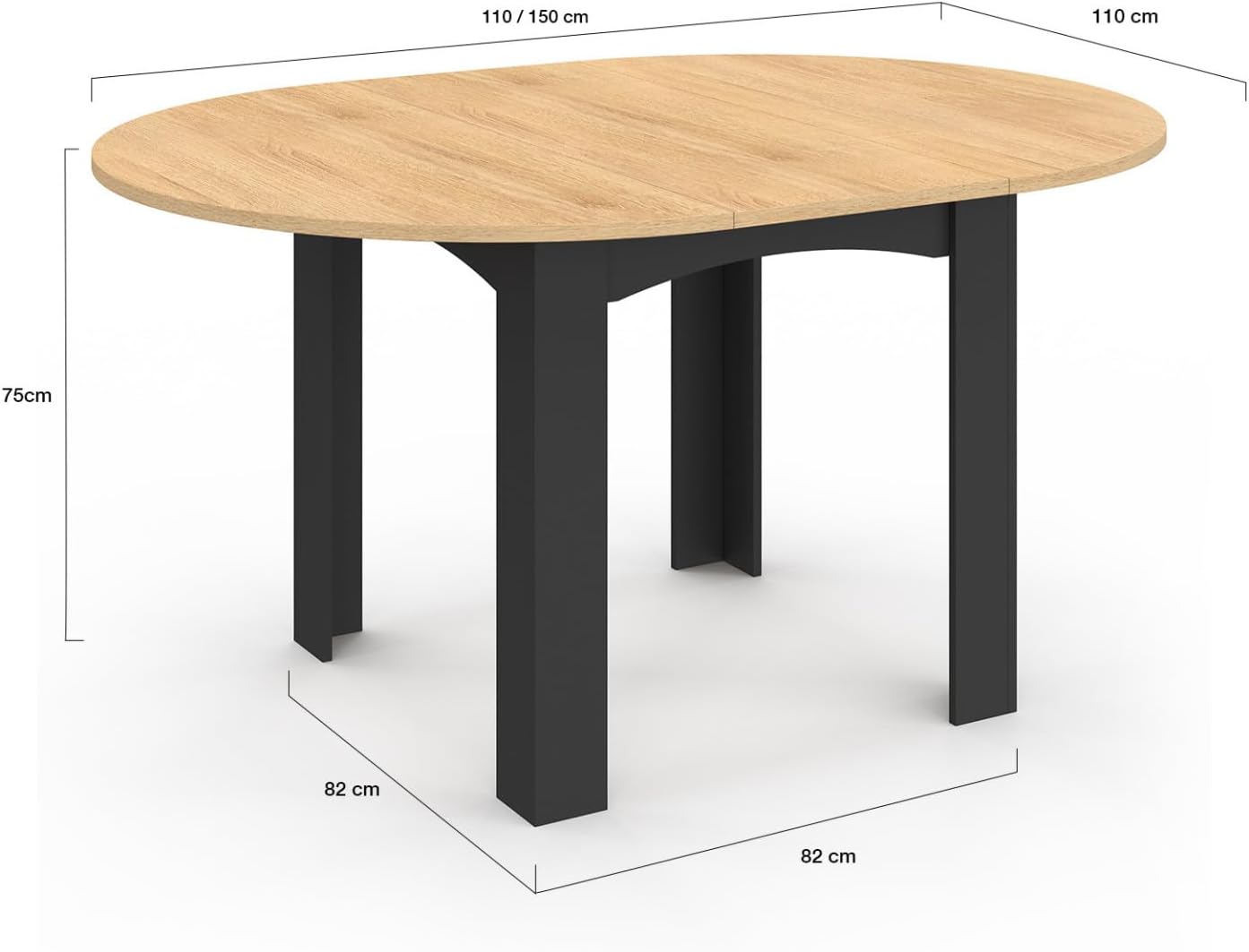 Craquez pour la table à manger ronde DONA et laissez entrer le style contemporain dans votre salle à manger ou votre cuisine !Cette table extensible bois et noir deviendra rapidement un élément phare de votre pièce dont vous ne pourrez vous passer ! Idéale pour les petits comme les plus grands espaces, la table à manger DONA avec son plateau extensible gain de place vous permettra de passer d’une capacité de 4 à 6, voire 8 personnes en un instant grâce à sa rallonge de 40 cm !Pratique et robuste, elle trouvera facilement sa place dans votre intérieur tout en garantissant une vraie stabilité !Ses courbes arrondies vous assurent d’être confortablement installé autour d’un repas convivial ou même d’un jeu de société avec votre famille ou vos amis.N’hésitez plus et optez pour cette table multifonction et design, parfaite pour le quotidien et les grandes occasions !Dimensions de la table à manger extensible ronde DONA 4-8 personnesDimensions globales : Longueur 110-150 cm x largeur 110 cm x Hauteur 75 cmDimensions des pieds : L. 10 cm x l. 10 cmEspace entre les pieds : 52 cmDimension de la rallonge : L. 110 cm x l. 40 cmMatériaux : Particules de bois (PB) mélaminé et MDFColoris : Bois et noirÀ monter soi-mêmeRetrouvez l’ensemble de notre collection contemporaine sur notre boutique en ligne !