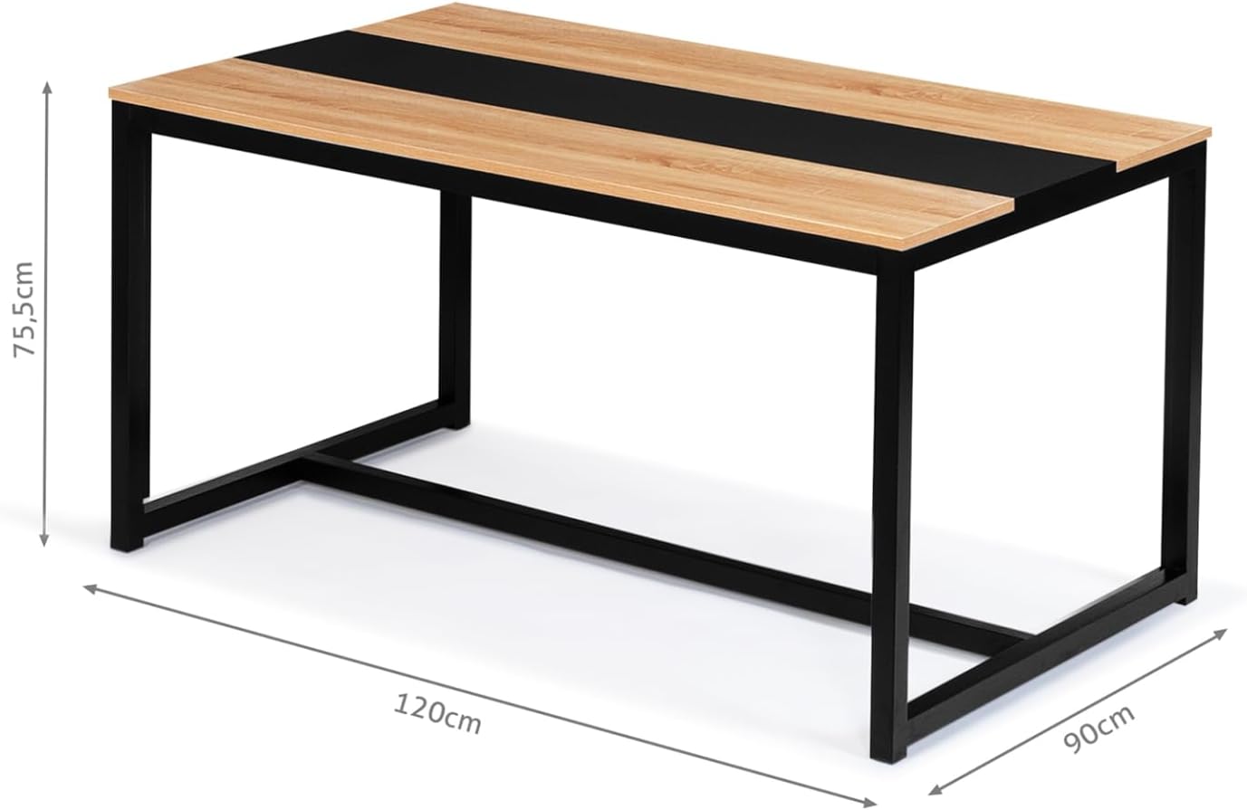 Vous cherchez une table à manger pratique et design pour vos repas du quotidien ? La table DOVER 6 personnes avec bande centrale noire est faite pour vous ! Grâce à son plateau long de 120 cm vous profiterez de bons moments conviviaux sans pour autant encombrer votre espace. Accueillez confortablement jusqu’à 6 personnes pour vos diners en famille ou entre amis !Stable et robuste, avec sa structure composée de tubes en métal de 4 x 4 cm, votre table DOVER vous garantira stabilité pour vos repas.Sa structure bi-matière bois et métal noir confère à votre décoration une touche authentique propre au style industriel. Le design bicolore bois naturel et noir imprégnera votre séjour d’une une ambiance chaleureuse et conviviale. Vous apprécierez le détail de la bande centrale noire mat qui apportera une touche chic à votre intérieur !Cette table est idéale si vous recherchez une table à la fois design et fonctionnelle. Profitez dès maintenant de cette table à manger DOVER pour 6 personnes à un prix irrésistible !Dimensions de la table à manger DOVER 120 cmDimensions globales : Longueur 120 cm x largeur 90 cm x Hauteur 75,5 cmDimensions des pieds en métal : 4 x 4 cmÉpaisseur du plateau en particules de bois : 1,8 cmCapacité : 6 personnesÀ monter soi-mêmeVous pouvez aussi associer cette table avec notre lot de 6 chaises SARA noires.Retrouvez également l’ensemble de nos modèles de tables et de notre collection industrielle sur notre boutique en ligne !