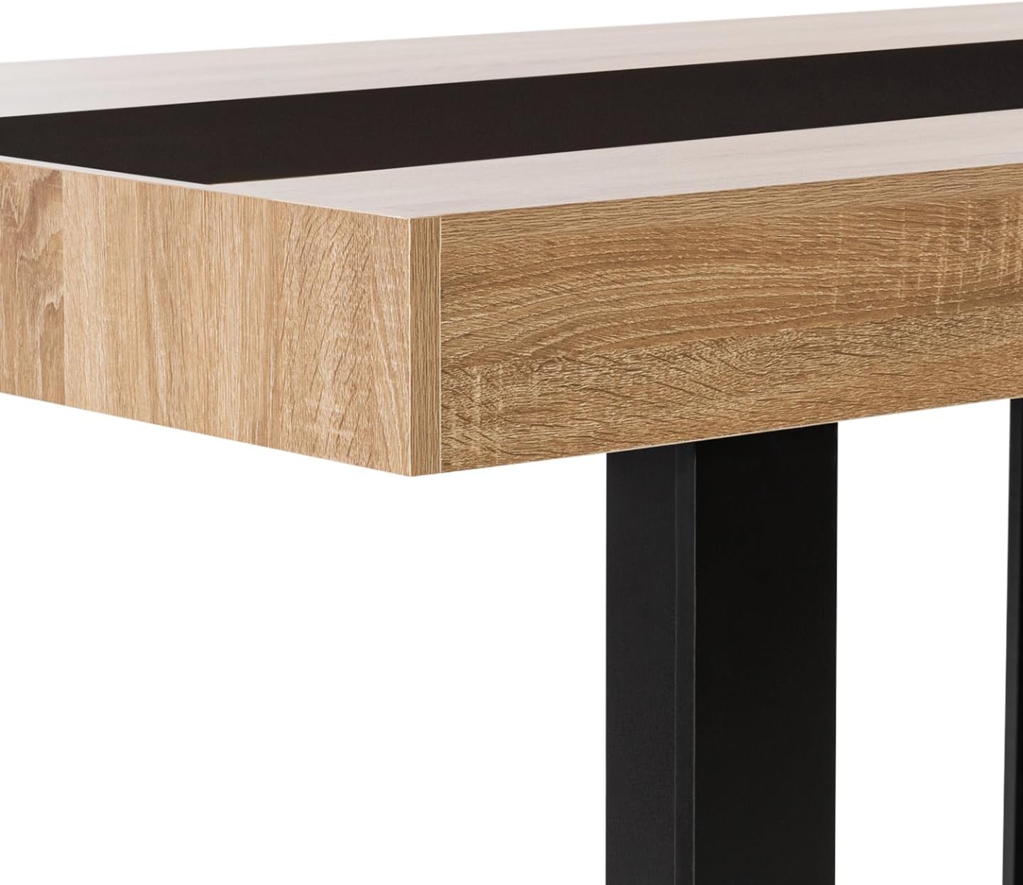 Vous aimez partager de bons repas avec vos amis, votre famille ? La table à manger 160 cm PHOENIX bois et noire avec bande centrale noire est faite pour vous ! Grâce à son grand plateau en particules de bois mélaminé, vous pourrez accueillir jusqu’à 6 convives et profiter de moments de partage entre amis ou en famille.Avec ses pieds en forme U, d’une largeur de 12,5 cm, cette table à manger très design vous offre stabilité. Sa structure robuste est idéale pour une décoration type loft contemporain. Ses lignes à l’aspect massif occuperont parfaitement l’espace dans une grande comme dans une petite salle à manger. Le design bicolore bois naturel et noir s’intégrera parfaitement à votre décoration pour créer une ambiance chaleureuse et conviviale. Vous apprécierez le détail de la bande centrale noire à la finition mate qui apportera une touche chic à votre décoration !Laissez-vous séduire par la table PHOENIX 6 personnes, et faites entrer le style contemporain chez vous ! Dimensions de la table PHOENIX 160 cmDimensions globales: Longueur 160 cm x largeur 90 cm x Hauteur 78 cmHauteur des rebords du plateau : 12 cmDimensions des pieds : l. 12,5 x H. 76 cmEspace entre l’extrémité du plateau et le pied : 20 cmEspace entre chaque pied : 100 cmÉpaisseur du plateau bois : 1,8 cmÉpaisseur des pieds bois : 1,5 cmCapacité : 6 personnesMatériaux : Particules de bois mélaminésÀ monter soi-mêmeCe modèle de la gamme PHOENIX existe également dans d’autres coloris :- Table à manger 160 cm bois gris- Table à manger 160 cm bois noir- Table à manger 160 cm bois blancDécouvrez l’ensemble de notre gamme PHOENIX sur notre boutique en ligne.