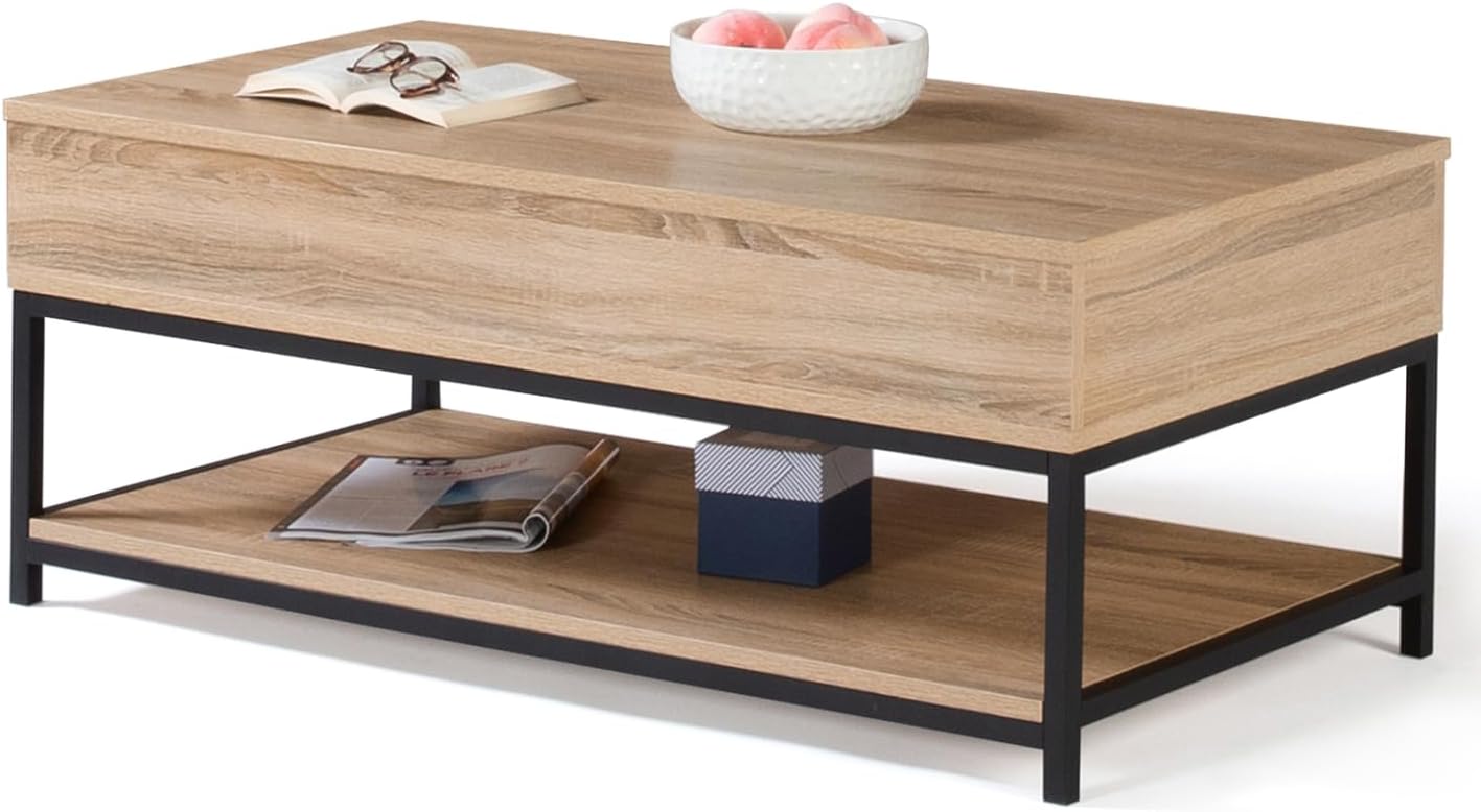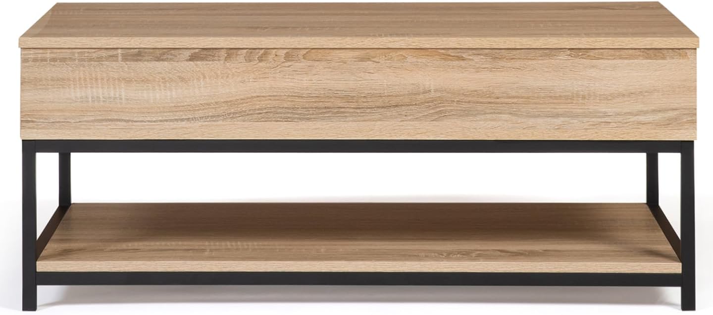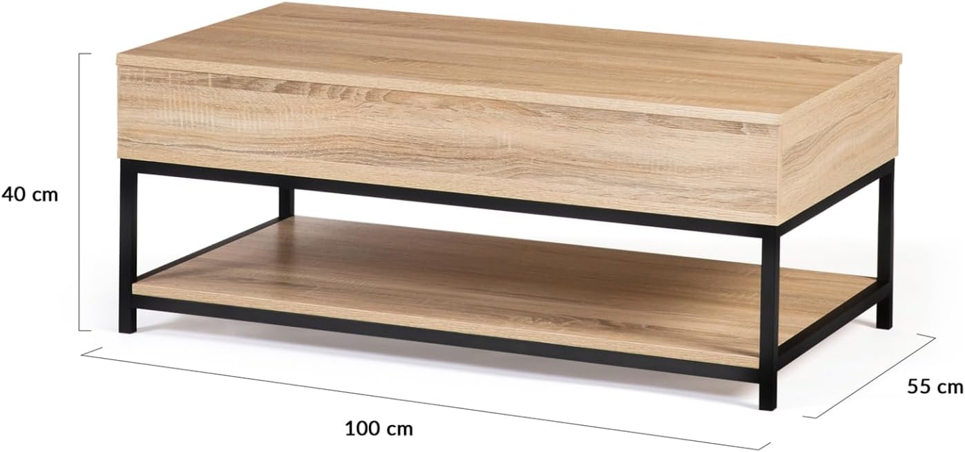 2 en 1, voici la dernière génération de table basse astucieuse avec système de plateau relevable : d’une simple table basse, elle se transforme en table à manger !Son plateau relevable, adaptable à toutes les situations, vous permettra d’organiser un apéritif entre amis, de prendre un repas ou une collation devant la télévision ou encore de vous aménager un coin bureau improvisé tout en gardant une position confortable dans votre canapé. Grâce à son mécanisme en acier laqué époxy noir, le plateau de cette jolie table basse se relève en un clin d’oeil.Fonctionnelle, elle offre également une solution de rangement fermé grâce au compartiment situé sous le plateau. Rangez-y revues, vaisselle ou encore snacks et gardez un espace libre pour poser vos plateaux télé ou votre ordinateur !Pratique, l’étagère inférieure offre un espace de rangement supplémentaire conçu pour accueillir télécommandes, magazines, tablette, et dégager le plateau de tout ce qui vous encombre !Une fois fermée, avec ses lignes épurées et ses finitions soignées, cette table basse en bois et métal, au style industriel, apportera une touche design et moderne à votre intérieur.La structure de cette jolie table basse, en panneaux de particules de bois (épaisseur 1,5 cm), lui confère stabilité et robustesse.Optez pour l’ingéniosité de cette table basse à plateau relevable en bois : soirées télé réussies assurées ! Dimensions de la table basse plateau relevable DETROITDimensions globales : Longueur 100 cm x largeur 55 cm x Hauteur 40 cmDimensions de l’espace de rangement : L. 97 x l. 52 cm x H. 12 cmHauteur de la table une fois ouverte : 55 cmHauteur entre l’étagère et le plateau : 16 cmHauteur entre le sol et l’étagère : 5 cmMatériaux : métal (1.6 cm) et panneaux de particules (1.5 cm)À monter soi-mêmeRetrouvez l’ensemble de notre collection industrielle sur notre boutique en ligne !