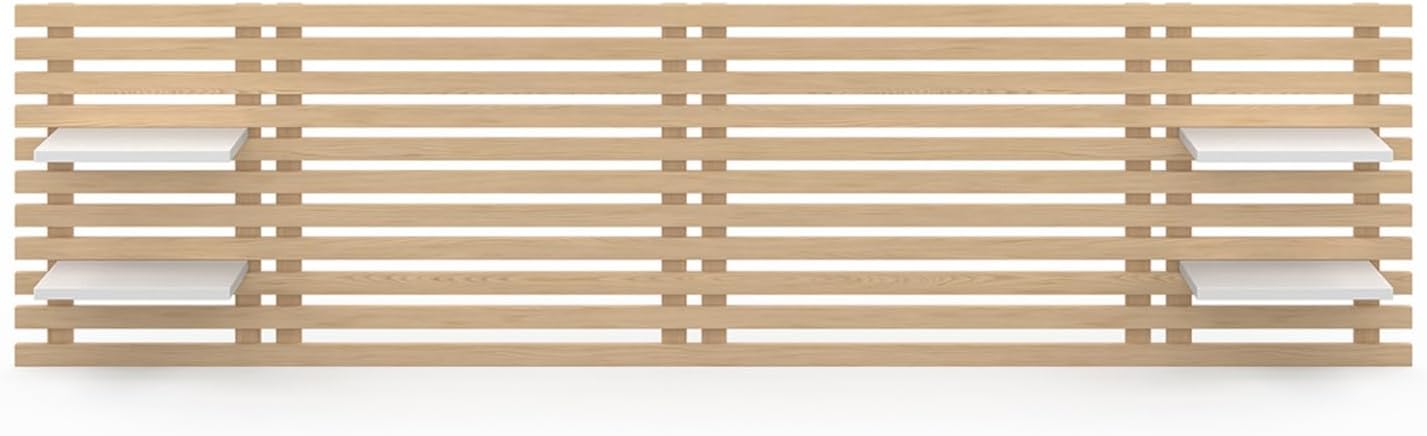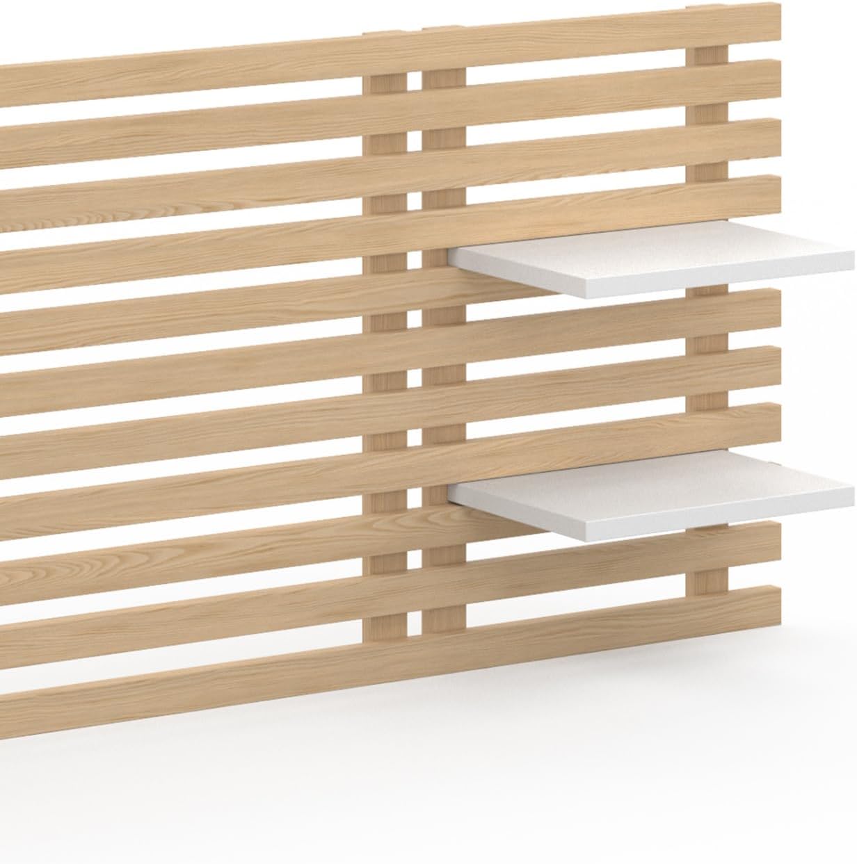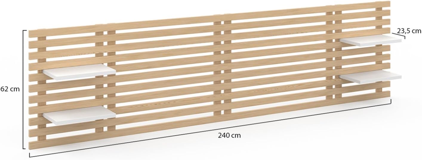 Craquez pour le look moderne de la tête de lit AVA au design bicolore effet bois clair et blanc. Cette tête de lit de 240 cm de long habillera votre mur et apportera une touche cossue et design à votre lit.Adaptable à tous les lits 140 cm et 160 cm, la tête de lit AVA est facile à installer. Grâce à son design fin et ses accroches murales, elle permet également un gain de place dans votre chambre à coucher.La tête de lit AVA est également composée de 4 tablettes de chevet blanches modulables que vous pouvez placer à la hauteur qui vous convient le mieux. Vous pourrez ainsi y déposer vos affaires personnelles, nécessaire de nuit, réveil ou encore lampes de chevet.Sa hauteur de 62 cm vous permet de vous adosser confortablement avec vos oreillers pour lire ou regarder votre série préférée. Pour un effet encore plus cocooning dans votre chambre, choisissez d’entrelacer une guirlande lumineuse sur le haut de votre tête de lit et profitez ainsi d’une ambiance chaleureuse toute la soirée. Dimensions de la tête de lit lattes AVA en bois clair et étagères blanchesDimensions globales : Longueur 240 cm x largeur 23,5 cm x Hauteur 62 cmDimensions d’une étagère : L.32,5 x l.20,5 x H.1,8 cmMatériaux : Panneaux de particules revêtement mélaminéColoris : Bois clair et étagères blanchesEspace entre chaque latte : 2 cmLongueur centrale entre les étagères : 160 cmKit de fixation inclusÀ monter soi-mêmeRetrouvez également nos autres têtes de lit disponibles sur notre boutique en ligne.
