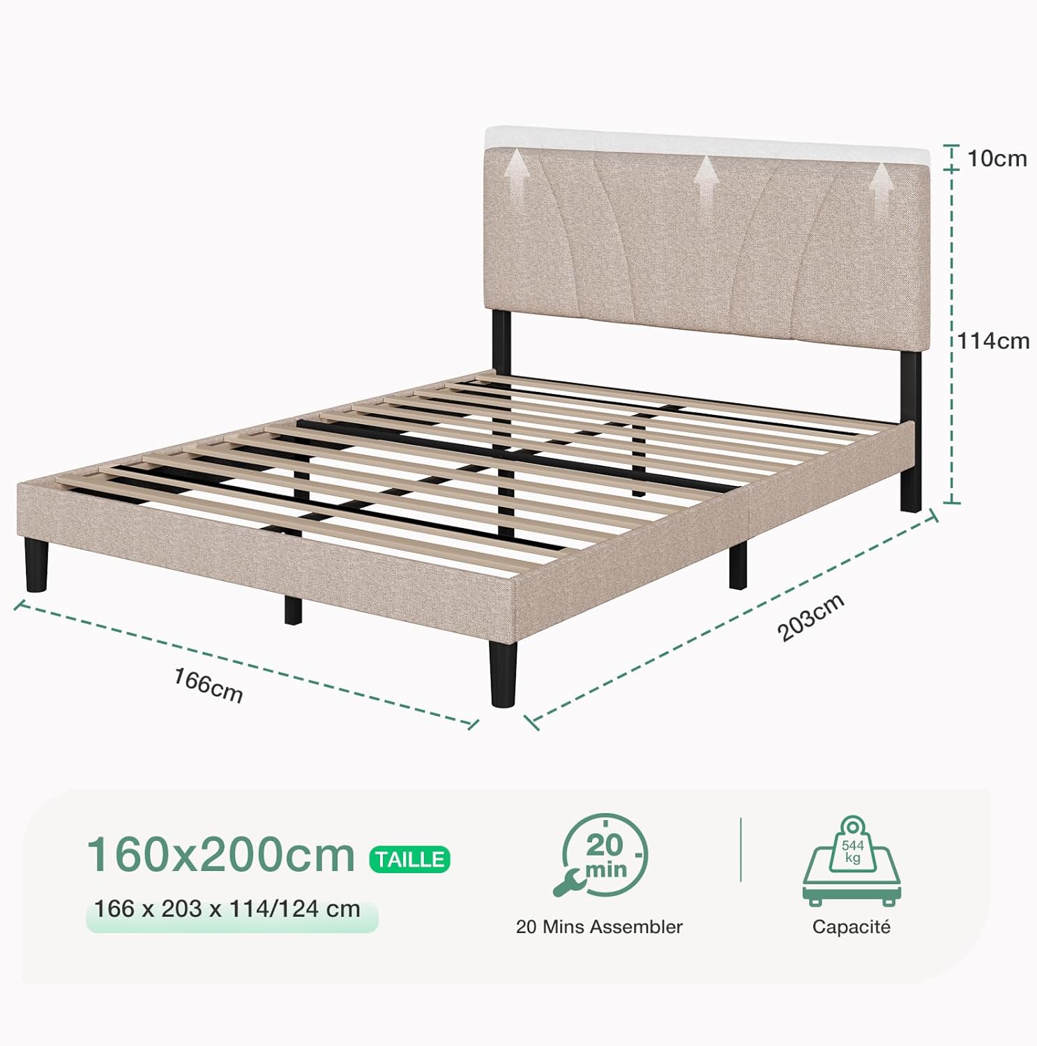 Structure stable – Ce cadre de lit avec tête de lit dispose d’une structure de cadre métallique avec 12 lattes en bois massif réparties uniformément, 3 pieds de support en fer et 6 pieds de support pouvant supporter un poids allant jusqu’à 544 KG.