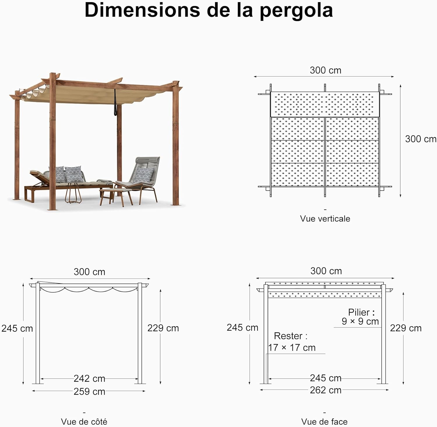 Vaste Espace : La pergola de 3 x 3 m offre beaucoup d’espace pour se détendre, et la structure ouverte autour du périmètre augmente la circulation de l’air, ce qui rend votre vie en plein air agréable à tout moment