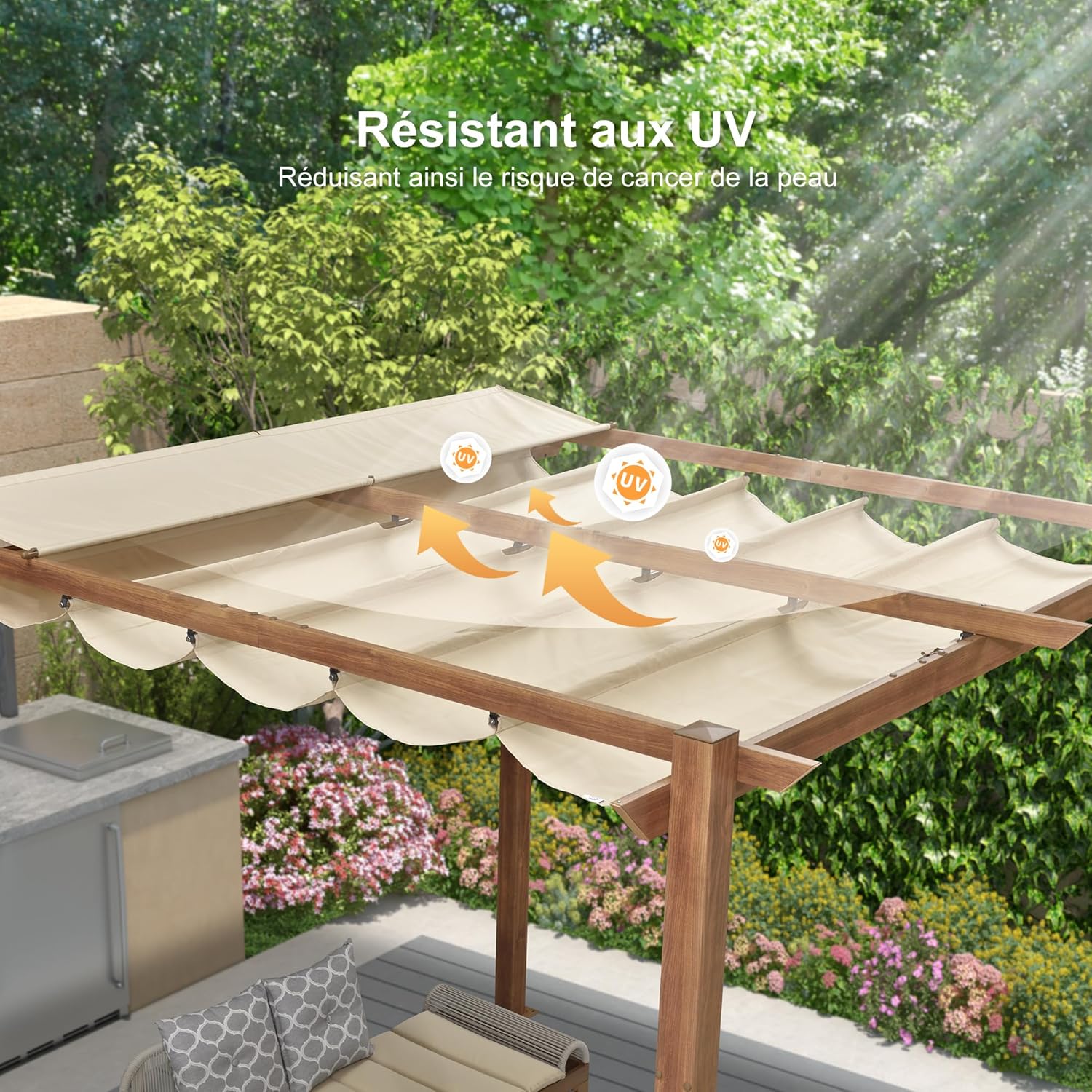Conception de Protection : Le petit auvent fixe supplémentaire au sommet de la pergola offre une meilleure protection contre les rayons ultraviolets et l’accumulation d’eau de pluie pour l’auvent rétractable