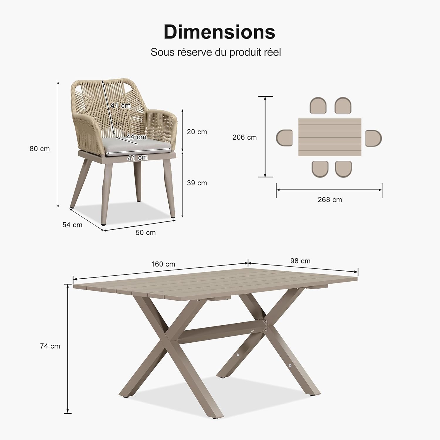 Cette mobilier de jardin conviennent pour 6 personnes. Dimensions: chaise 41 cm (L) × 44 cm (W) × 80 cm (H), table 160 cm (L) × 100 cm (W) × 74 cm (H). Idéale pour les rassemblements, les fêtes ou les moments de détente, elle offre un espace généreux et un confort optimal
