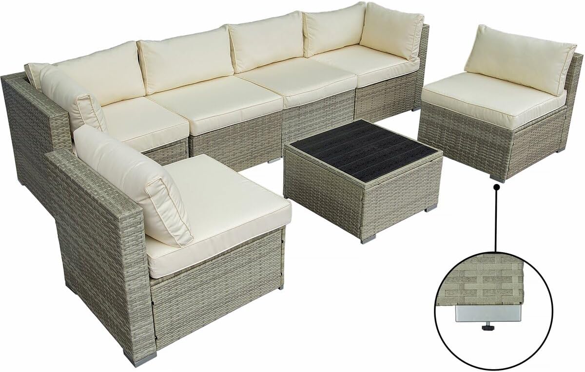 Canapé de jardin panoramique « Elia » – 6 places – Dimensions du canapé : 296 x 148 x 70 cm – Dimensions de la table : 63 x 63 x 37 cm – Poids maximum supporté : 160 kg – Résine tressée – Gris