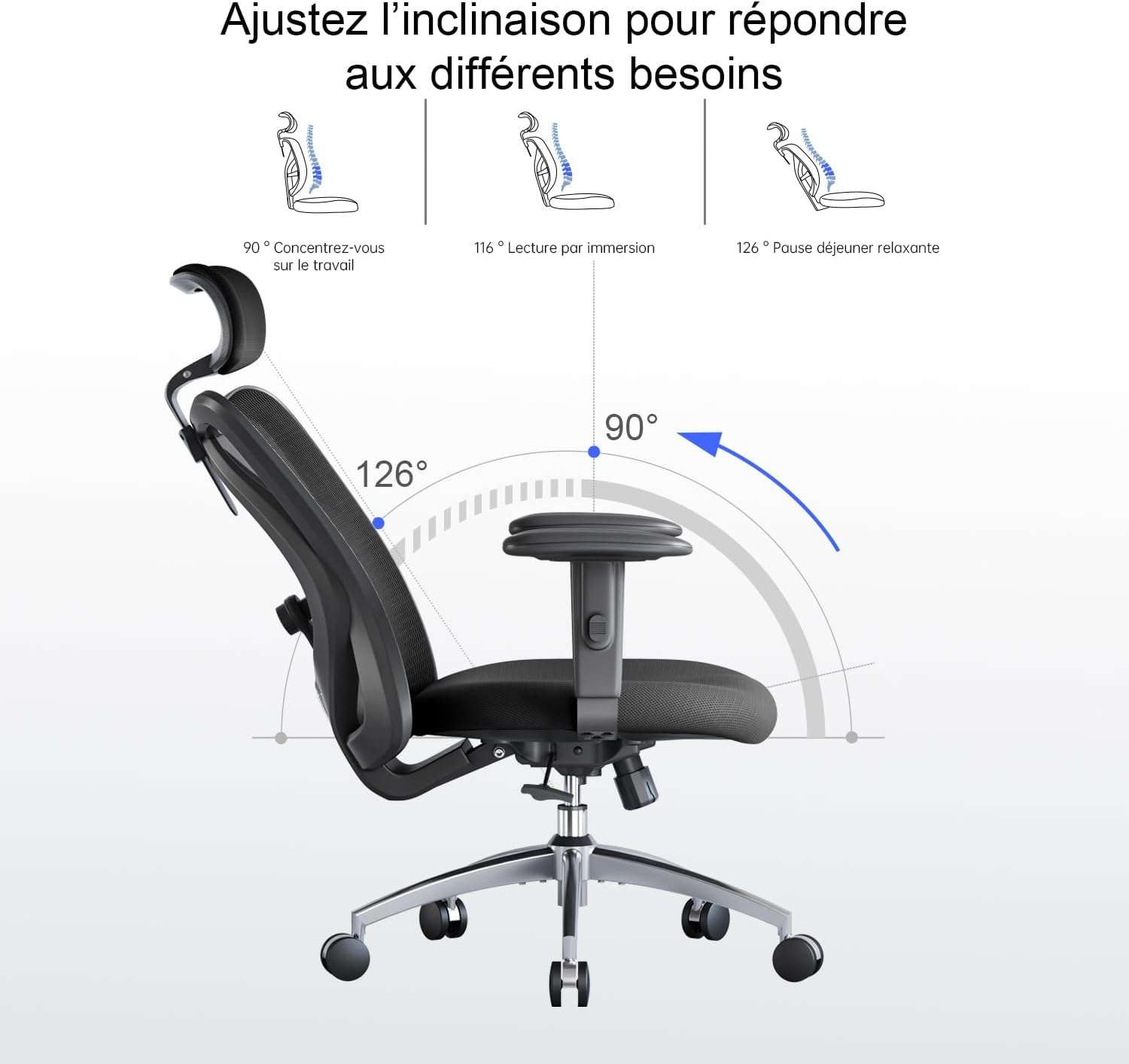 ★[Design ergonomique] Cette chaise de bureau dispose de 5 réglages ergonomiques vous aident à trouver la position assise la plus confortable pour de longues périodes de temps. Le dossier réglable, le réglage de l’appuie-tête, le réglage de la hauteur et de l’inclinaison du siège, ainsi que les accoudoirs réglables en hauteur, vous offrent une expérience personnalisée.
