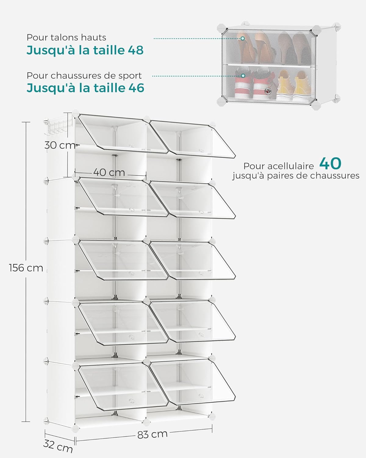 10 compartiments : Cet organiseur peut contenir jusqu’à 40 paires de chaussures. Avec crochets latéraux pratiques