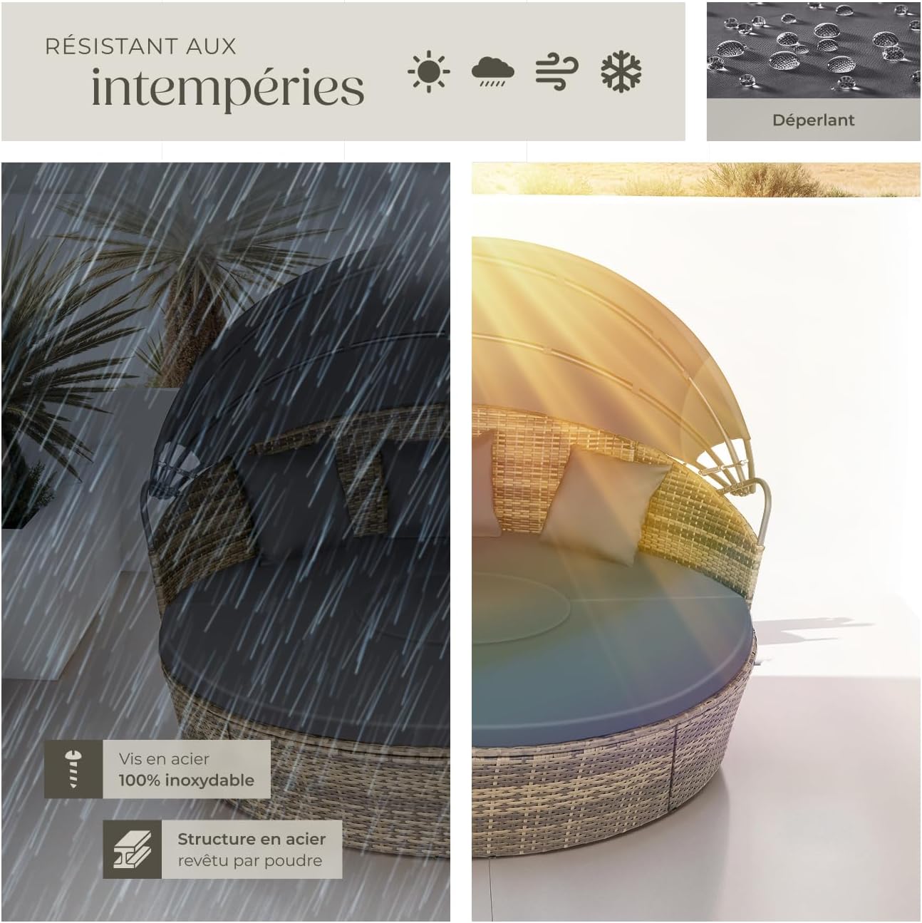 ÉLÉGANCE DURABLE POUR VOTRE ESPACE EXTÉRIEUR : Notre salon de jardin allie parfaitement l’élégance et la durabilité. La résine tressée haut de gamme résiste aux UV et aux intempéries, garantissant que votre mobilier conserve son allure chic année après année. Les housses amovibles et faciles à nettoyer simplifient l’entretien, vous permettant de profiter pleinement de votre table de jardin extérieur et de vos chaises sans souci.