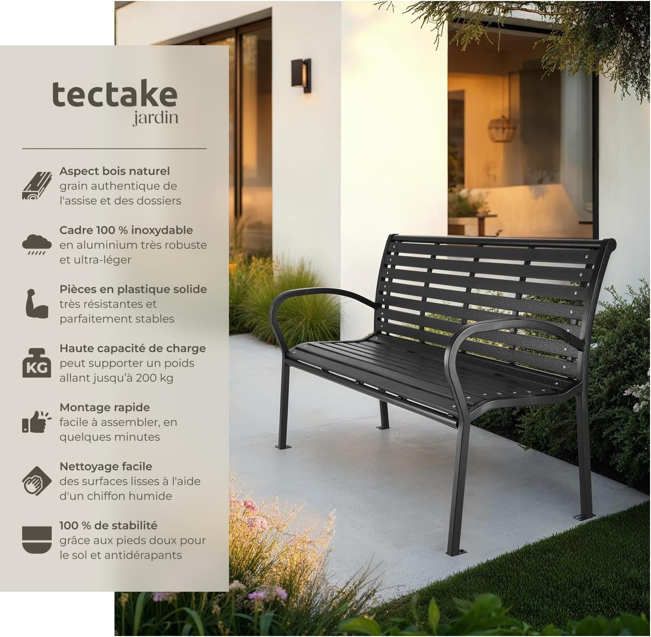 Points forts Banc de jardin élégant pour jusqu’à 3 personnes Accoudoirs incurvés Dossier ergonomique Adapté pour une utilisation en extérieur Structure stable en acier laqué Peut être vissé au sol Nettoyage sans effort Montage facile et rapide