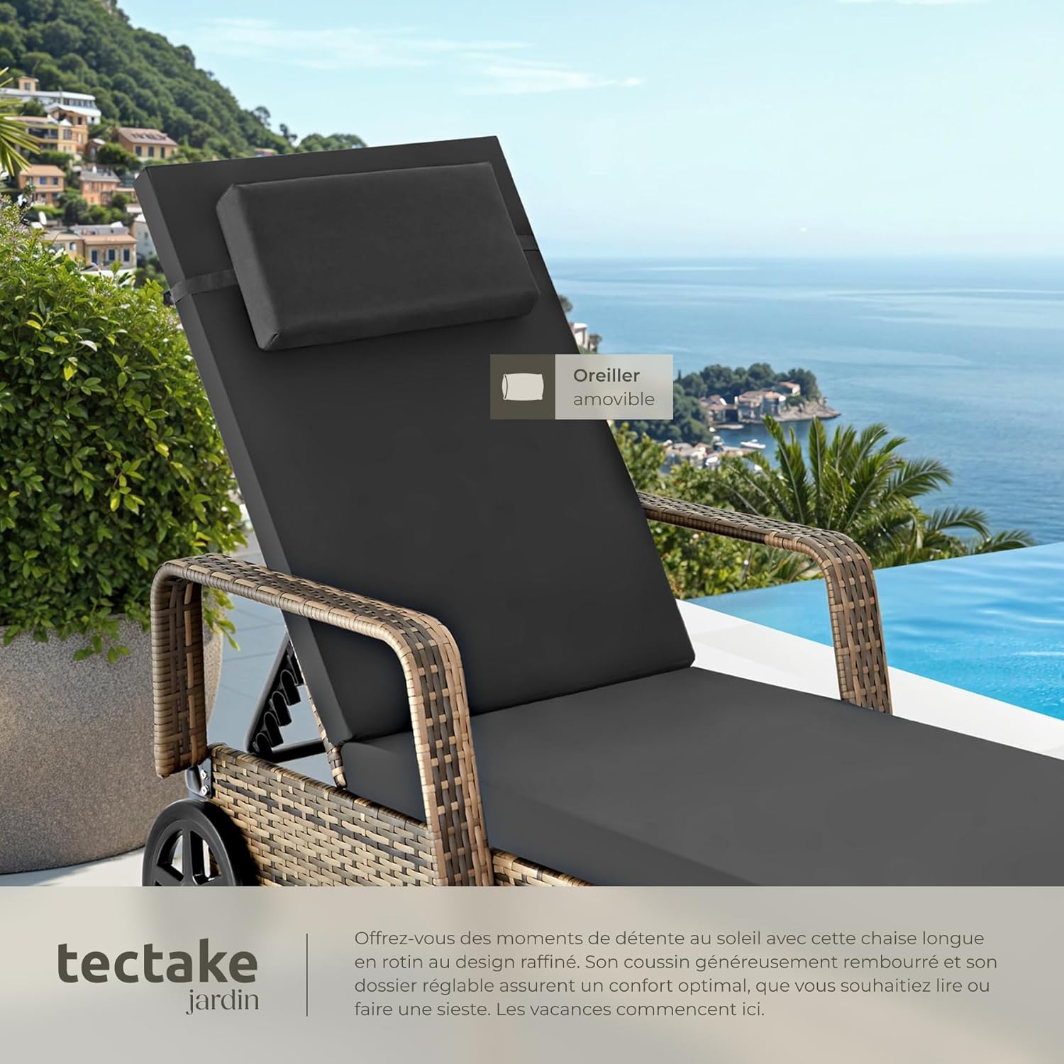 Détends-toi et relaxe dans ton oasis de bien-être personnel sur le transat en rotin à roulettes de tectake. Un design simple mais attrayant et une combinaison de matériaux contrastés rendent le transat à roulettes visuellement accrocheur pour le balcon, le sauna ou l’espace bien-être. Les roues à l’extrémité de la tête garantissent un transport facile. Le dossier est réglable en hauteur sur 6 positions et peut donc être ajusté en fonction de la position du soleil – ici, tu peux confortablement laisser ton âme se balancer.
