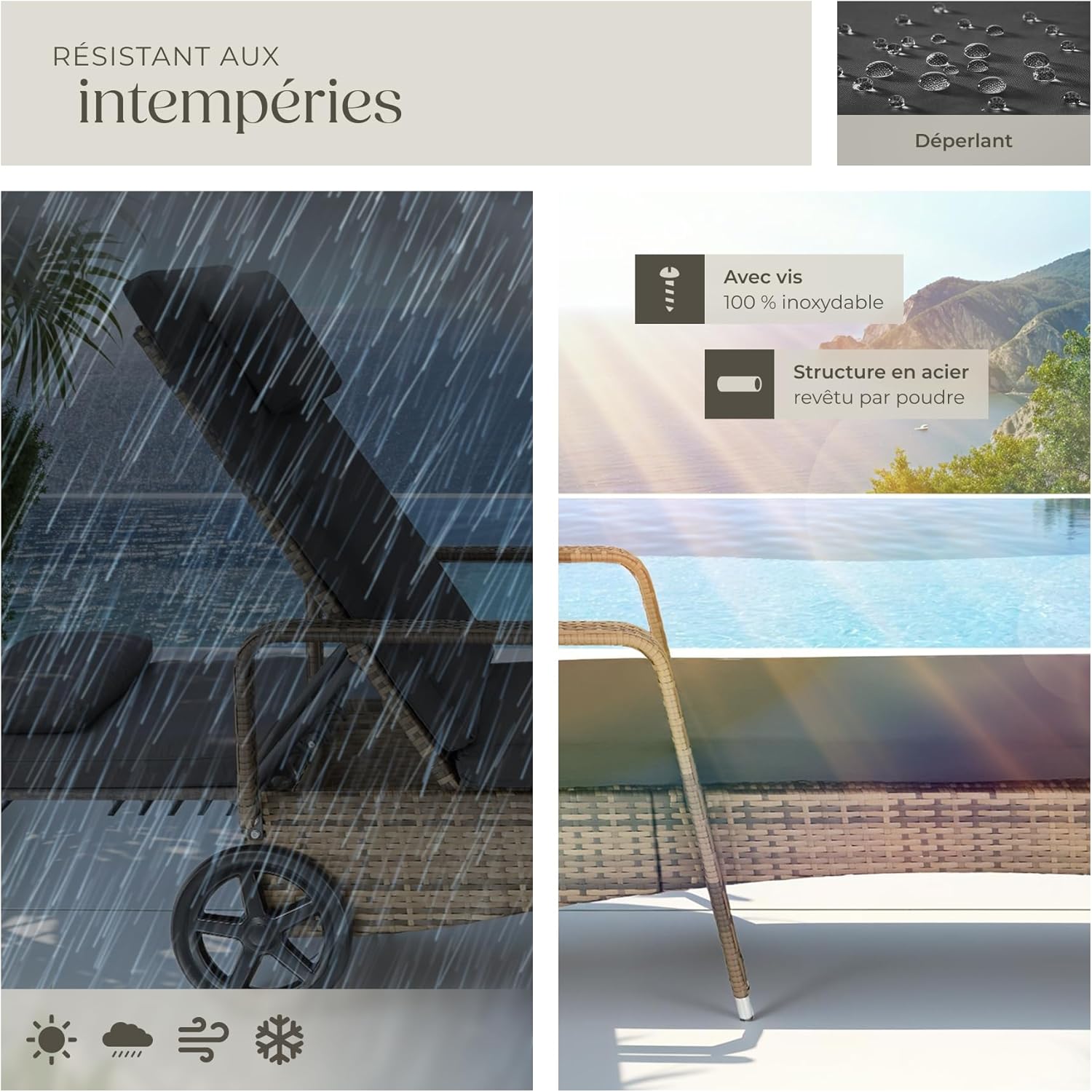 RÉSINE TRESSÉE DURABLE : La résine tressée de qualité supérieure de notre bain de soleil resine tressee garantit à la fois élégance et durabilité. Résistant aux intempéries, ce transat exterieur est un investissement durable pour votre mobilier jardin. Facile à entretenir, il reste impeccable saison après saison, faisant de ce transat de piscine ou chaise longue exterieur un choix pratique et esthétique.