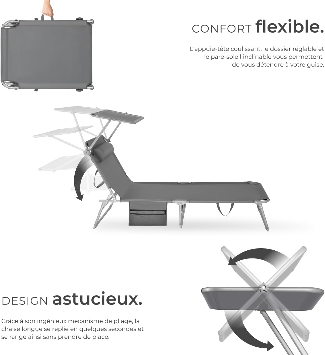 Le bain de soleil est équipé d’un confortable coussin pour la tête et d’une pochette latérale pratique composée d’un compartiment en maille filet et d’une poche zippée.