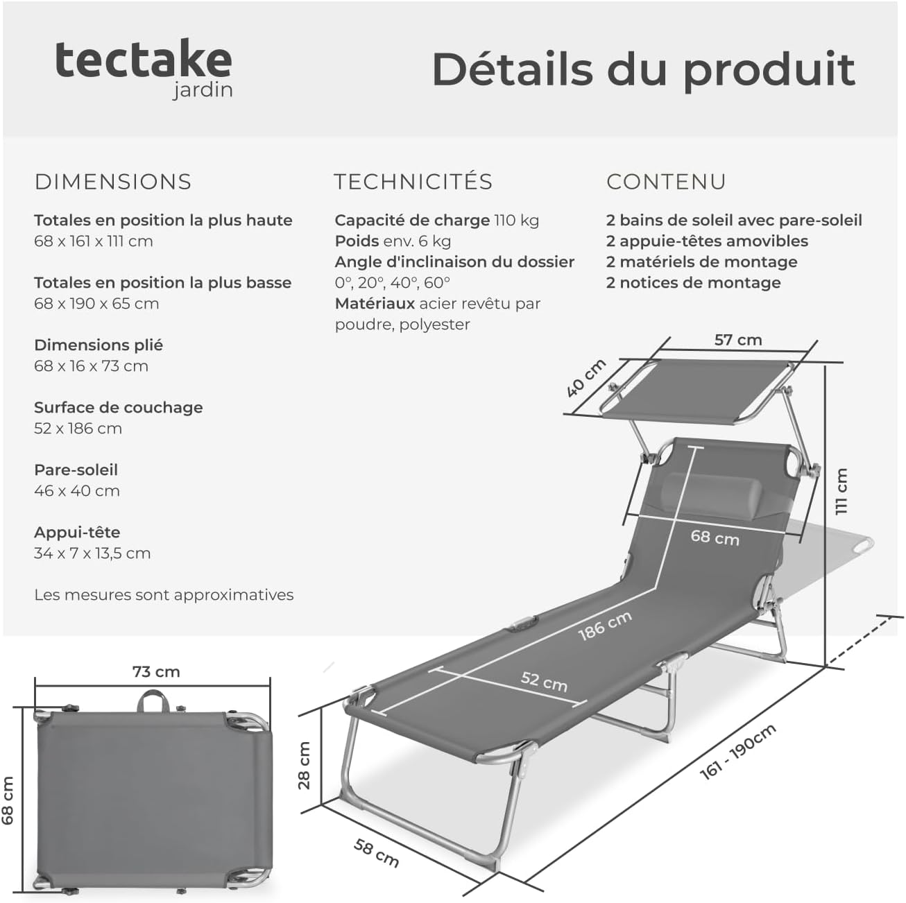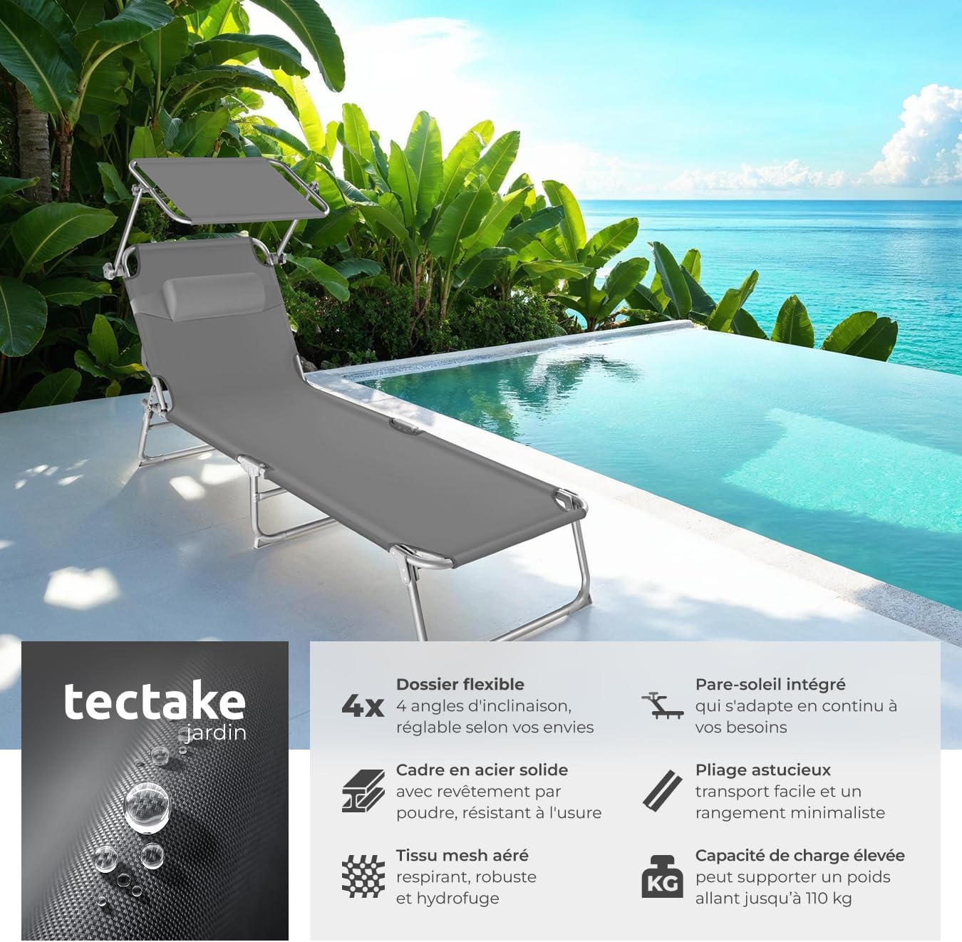 Le dossier réglable en 4 positions, le toit pare-soleil réglable de manière flexible, l’appuie-tête moelleux et la surface de couchage confortable vous assurent une détente optimale. Les chaises longues légères de tectake sont idéales pour les voyages grâce au mécanisme de pliage simple, aux dimensions idéales à l’état plié et aux poignées de transport pratiques.