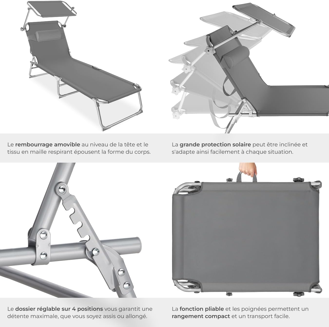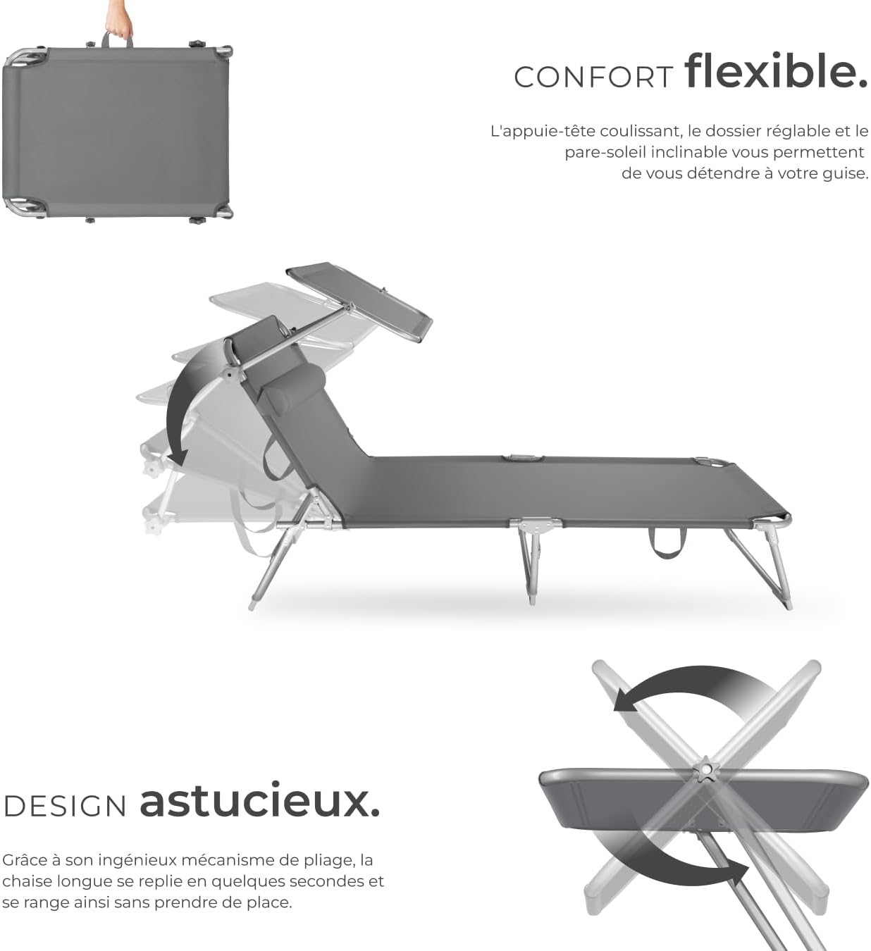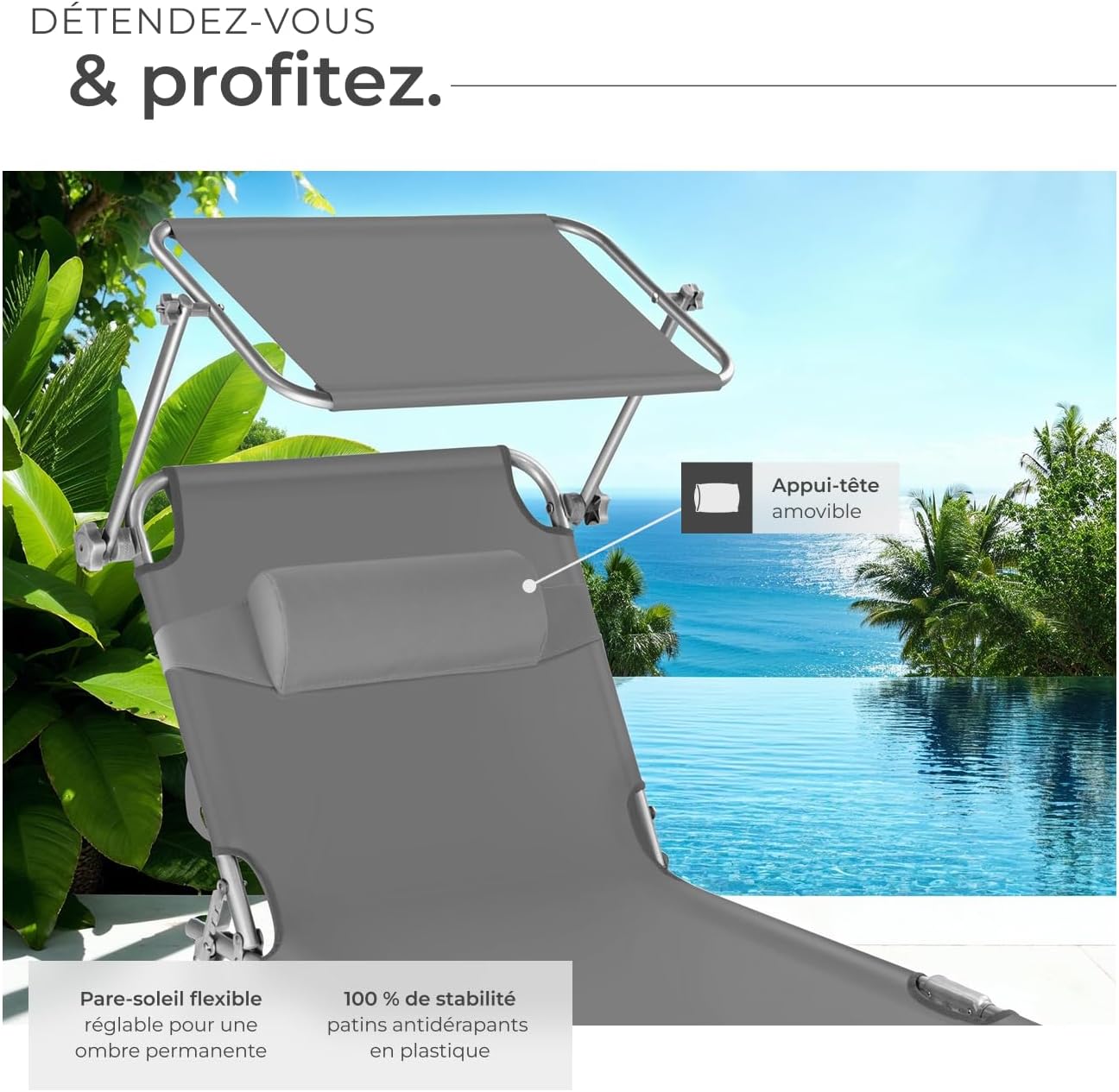RELAXATION À LA CARTE: Avec nos chaises longues jardin extérieur, profitez de quatre niveaux de réglage du dossier pour un confort sur mesure. Que vous souhaitiez lire, bronzer ou siester, le transat jardin extérieur s’adapte à toutes vos envies. L’appuie-tête moelleux et le pare-soleil inclinable garantissent un bien-être absolu sous le soleil d’été.
