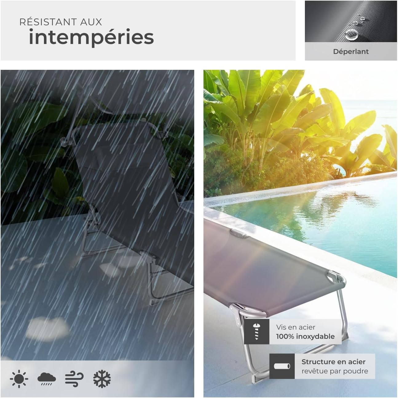 MOBILITÉ SANS EFFORT: Embarquez pour l’évasion où que vous soyez! Nos chaises longue pliantes sont dotées d’anses pratiques pour le transport. Légères et compactes, elles se plient rapidement pour accompagner vos moments de détente dans le jardin, sur la terrasse ou lors de vos déplacements en transat de plage pliable.