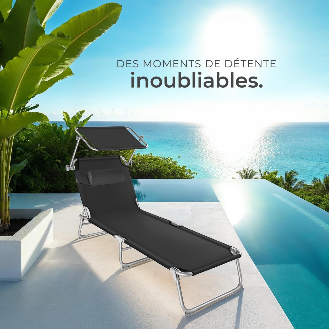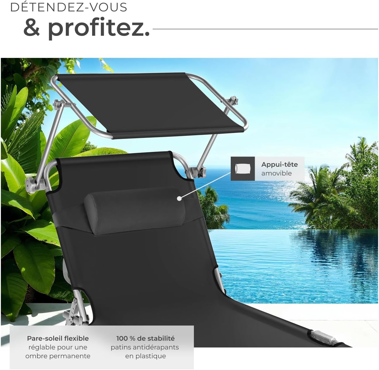 RELAXATION À LA CARTE: Avec nos chaises longues jardin extérieur, profitez de quatre niveaux de réglage du dossier pour un confort sur mesure. Que vous souhaitiez lire, bronzer ou siester, le transat jardin extérieur s’adapte à toutes vos envies. L’appuie-tête moelleux et le pare-soleil inclinable garantissent un bien-être absolu sous le soleil d’été.