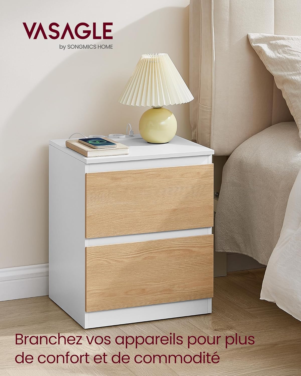 Multiprise intégrée : 2 prises CA, 2 Ports USB-A permettent de recharger jusqu’à 4 appareils.Espace de rangement généreux : 2 grands tiroirs et 1 plateau de table spacieux offrent beaucoup de place pour vos objets.Grande capacité de charge : Le plateau supporte jusqu’à 50 kg et chaque tiroir jusqu’à 4,7 kg.Design minimaliste : Les poignées invisibles et les lignes épurées s’adaptent à différents styles d’intérieur.Montage facile : Les instructions claires et les pièces numérotées permettent un montage rapide.
