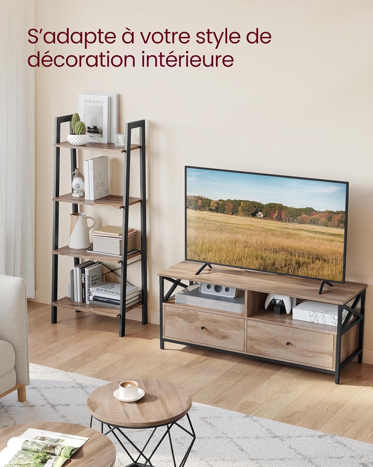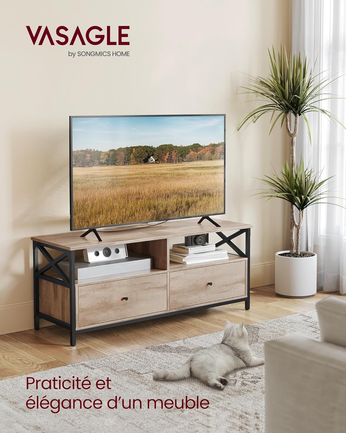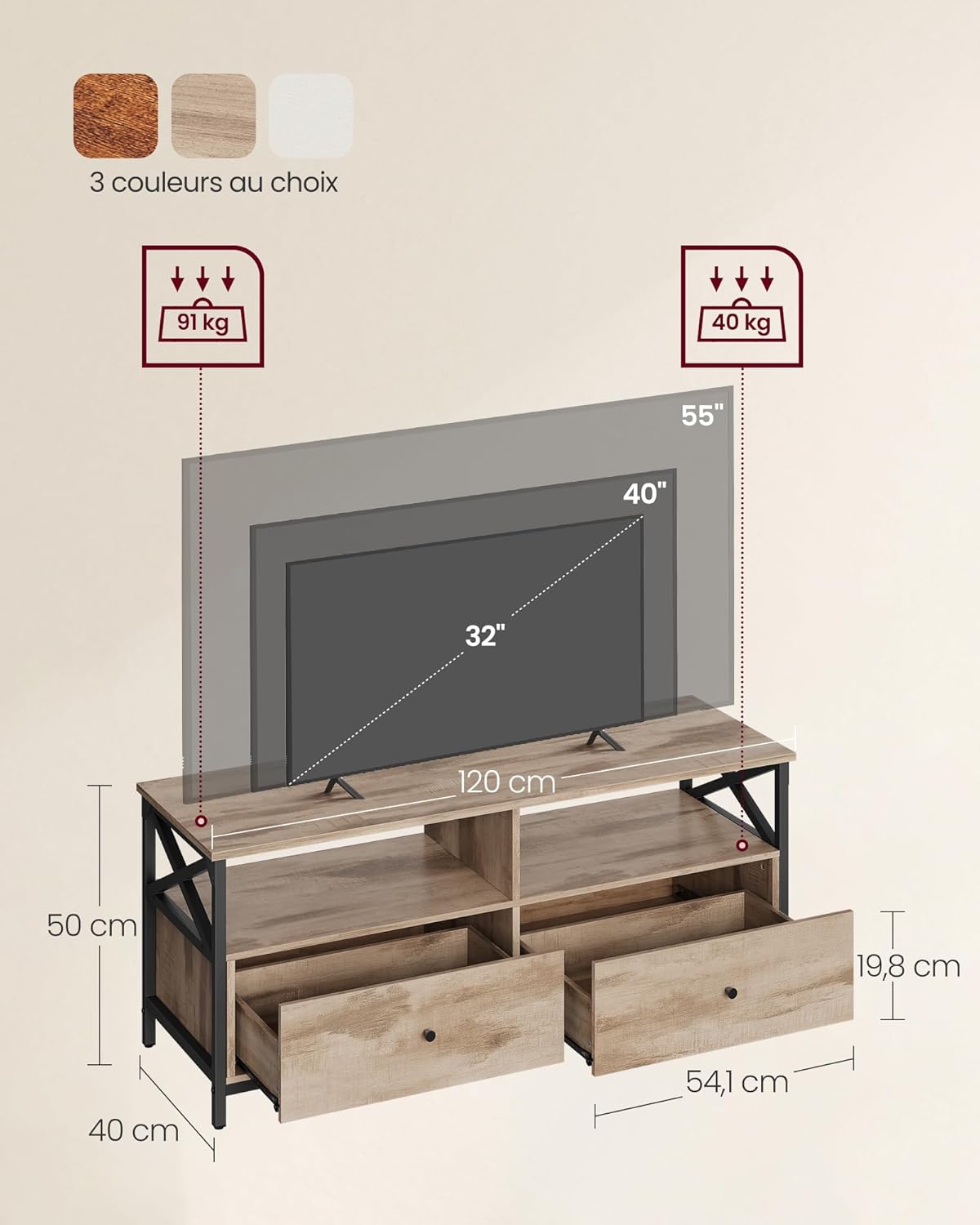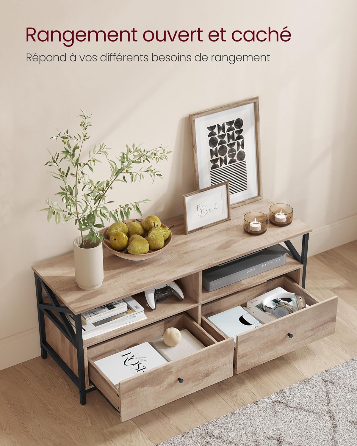 [Rangement ouvert et fermé] Ce meuble TV de 40 x 120 x 50 cm peut accueillir une télévision jusqu’à 55 pouces. Il dispose également de 2 tiroirs pour le rangement et de 2 étagères ouvertes pour exposer vos bibelots