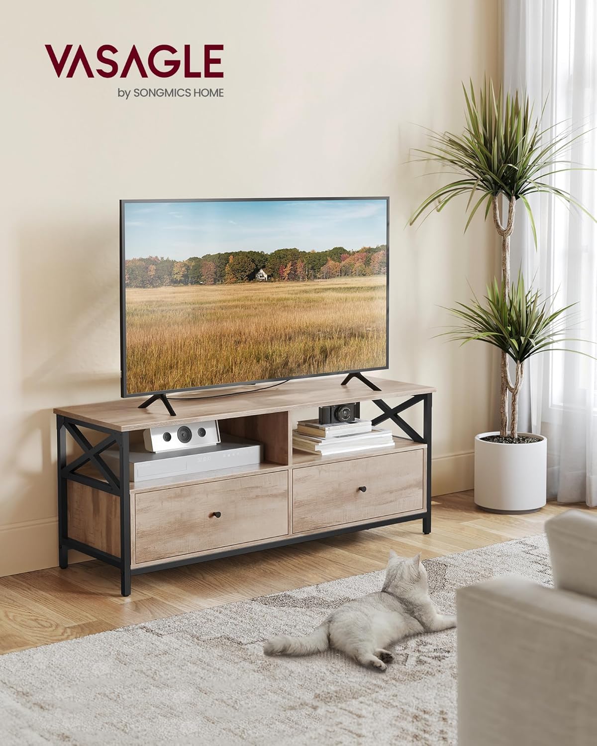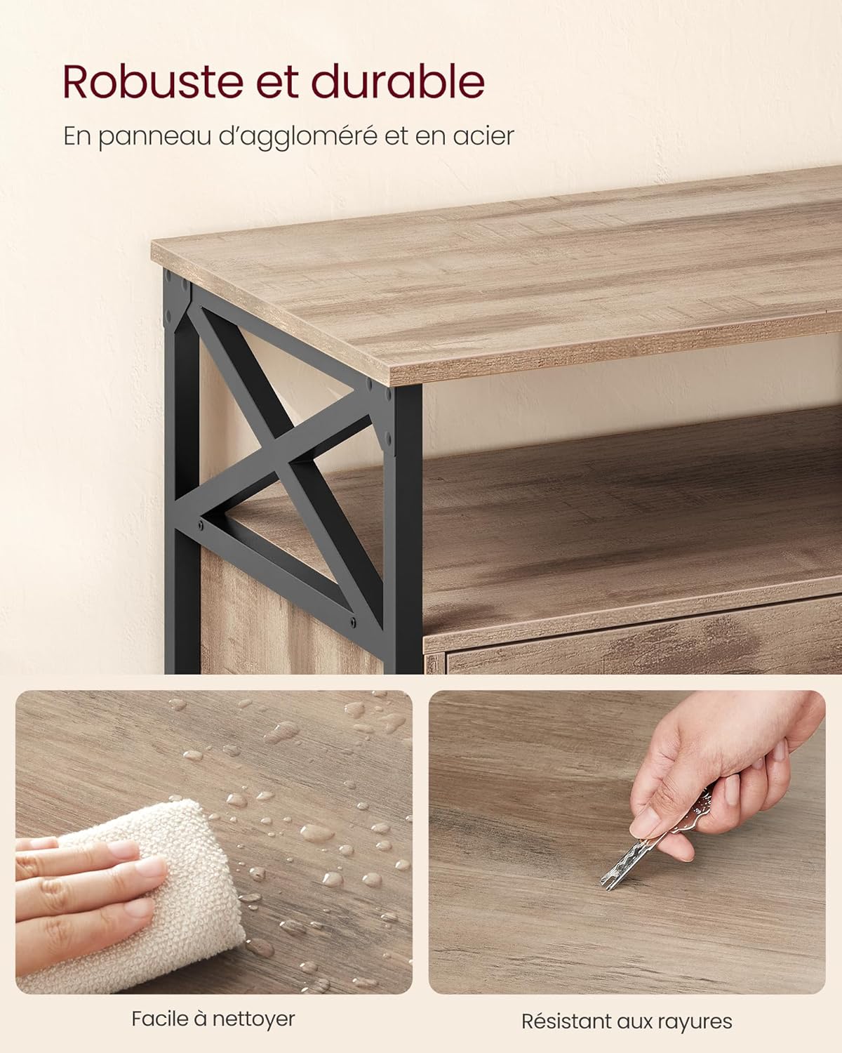 [Ce que vous obtenez] Un meuble de téléviseur avec 2 étagères ouvertes, 2 tiroirs, une surface spacieuse et 4 pieds réglables, qui assurent une bonne stabilité même sur un sol légèrement irrégulier