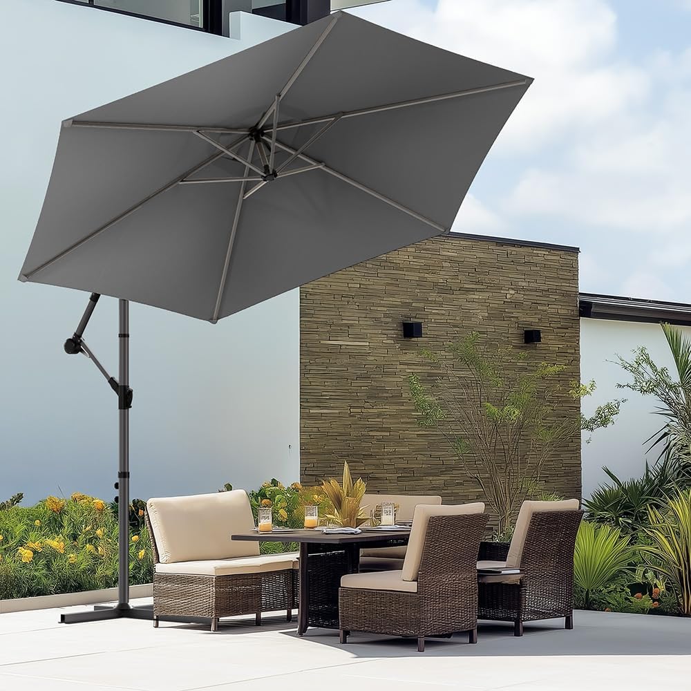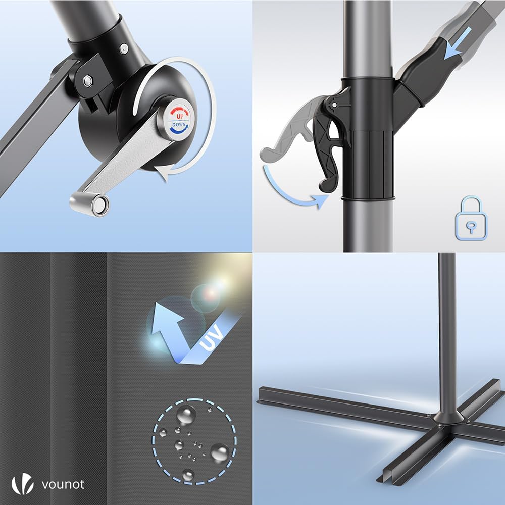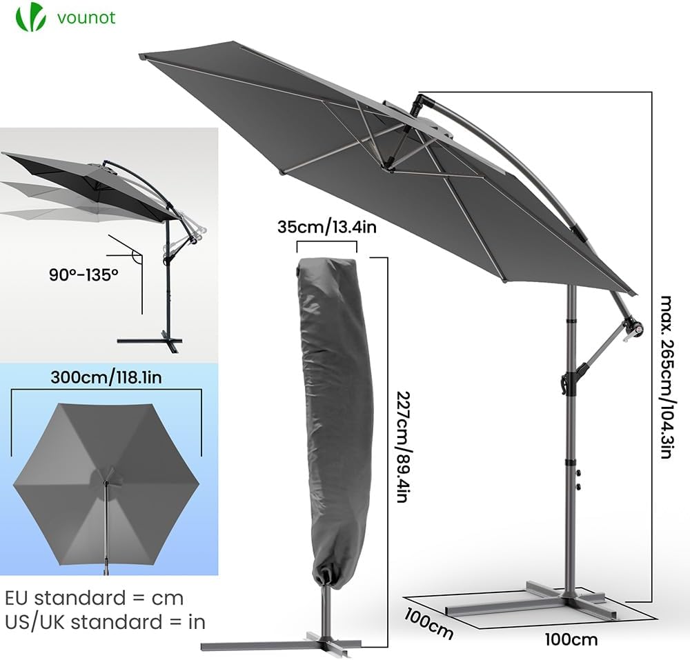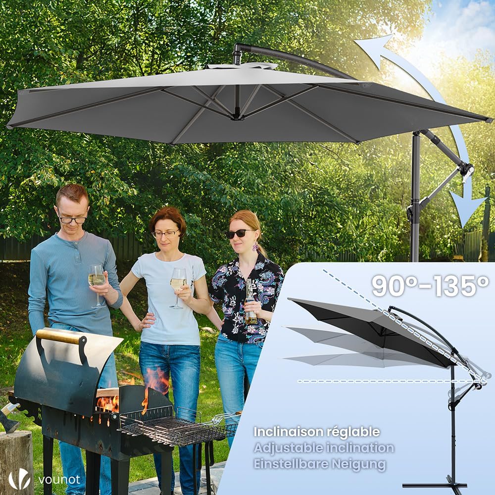 VOUNOT Parasol déporté hexagonale 3M avec Manivelle Anti-Retour Parasol déporté inclinable Toile 180 gr/m2 avec protection UV Hauteur 235cm 6 Baleines en acier Inclus housse de protection Gris