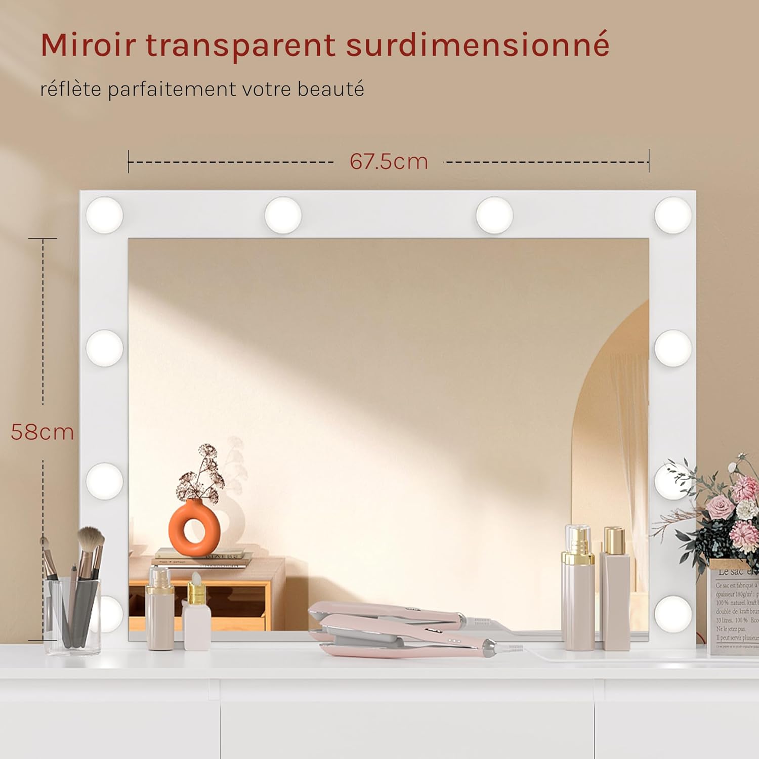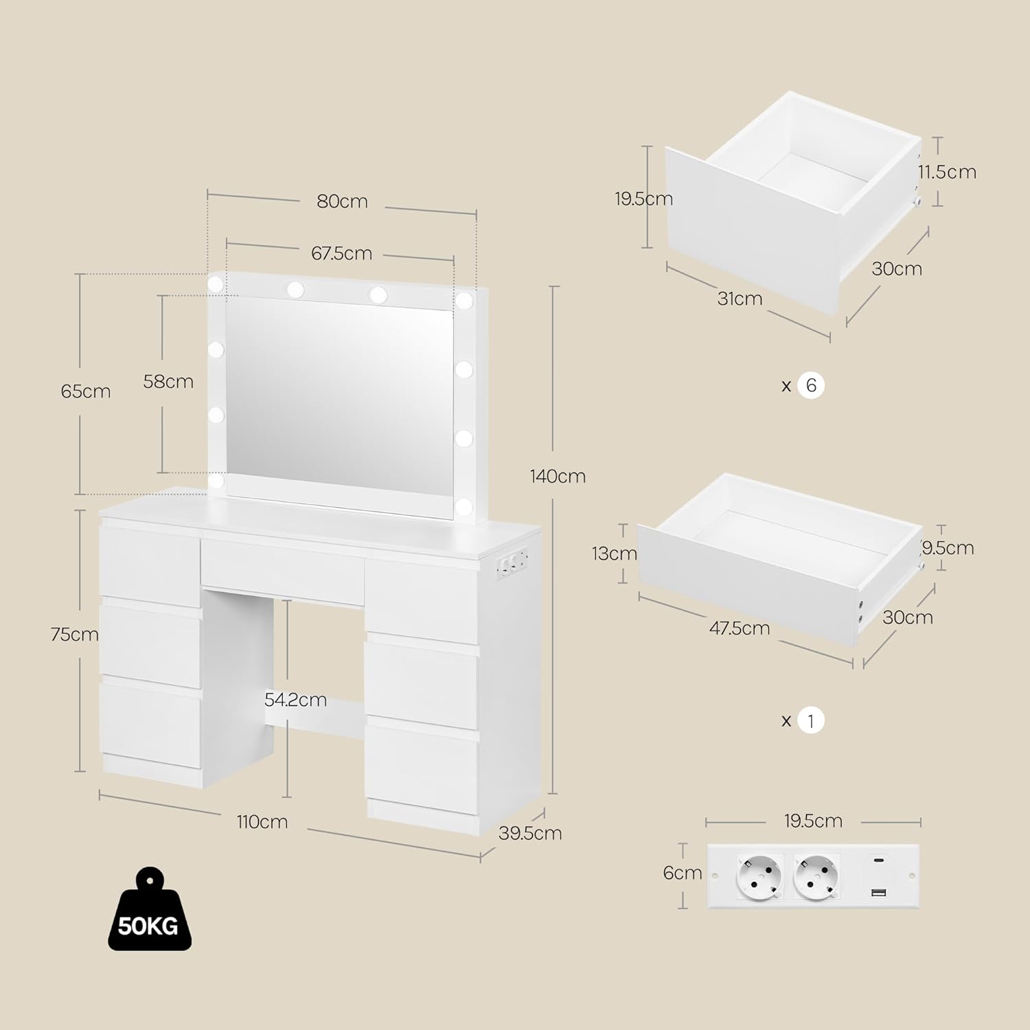 COIFFEUSE AVEC PRISES INTÉGRÉES : Sur le côté droit du bureau de maquillage se trouve une multiprise avec un câble de 1,5 m, qui comprend 2 prises standard, 1 USB-A et 1 USB-C pour faciliter l’utilisation de fer à friser, de lisseur, de sèche-cheveux, etc. sur votre bureau. Vous pouvez également recharger les ordinateurs portables, les iPads, les téléphones mobiles, les écouteurs sans fil, les lampes de bureau, etc.