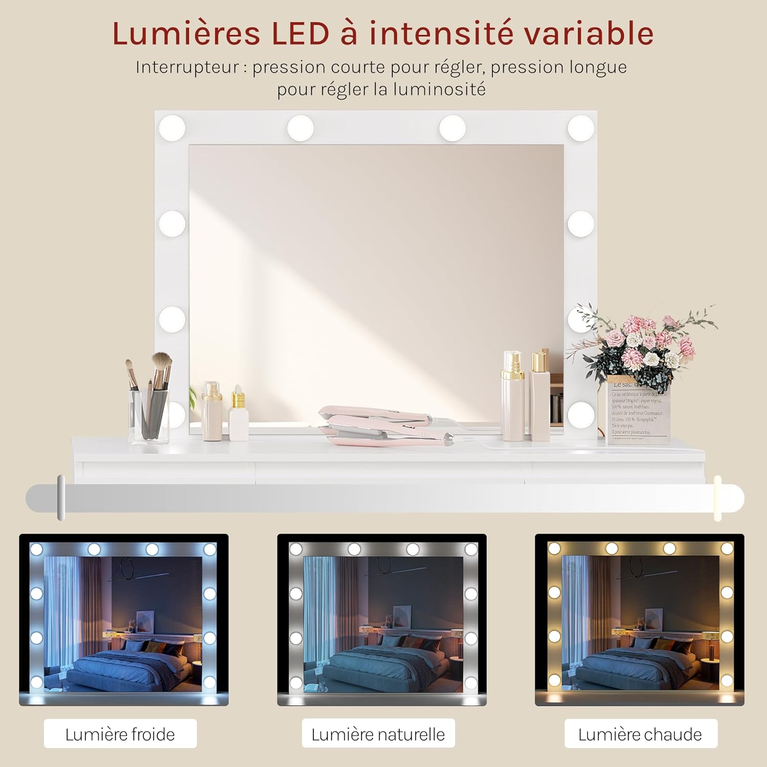 MIROIR LED À LUMINOSITÉ RÉGLABLE : Le miroir LED rectangulaire de 64×57 cm est clair et parfait pour votre coiffeuse. La bande lumineuse LED est alimentée par l’interface USB et réglée par l’interrupteur, offrant 3 températures de couleur et une variété de luminosité. Un appui court sur l’interrupteur permet de régler la température de couleur, et un appui long est pour régler la luminosité