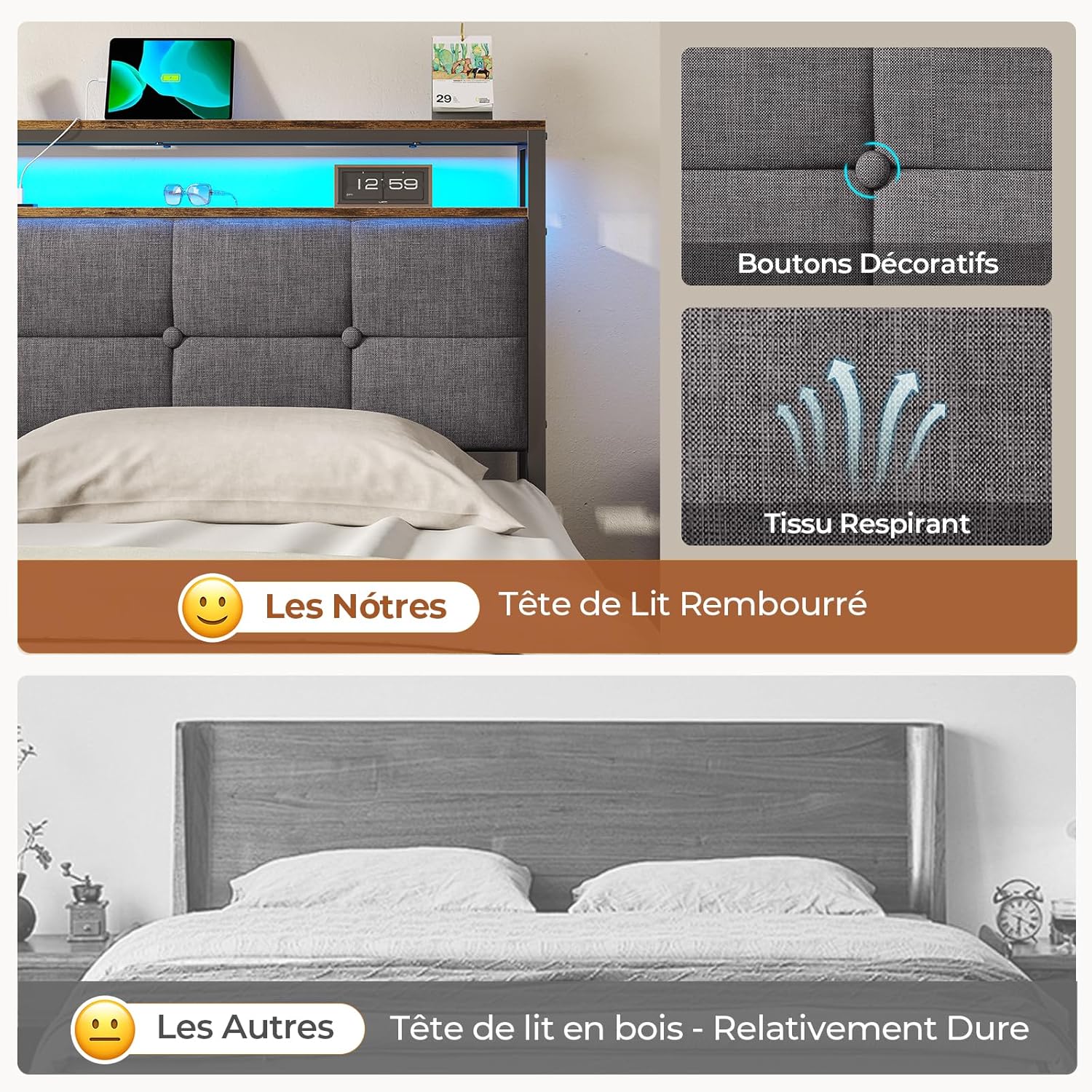 La multiprise pratique intégrée à la tête de lit vous permet de profiter sereinement de vos moments de détente avec vos portables sans soucis de charge