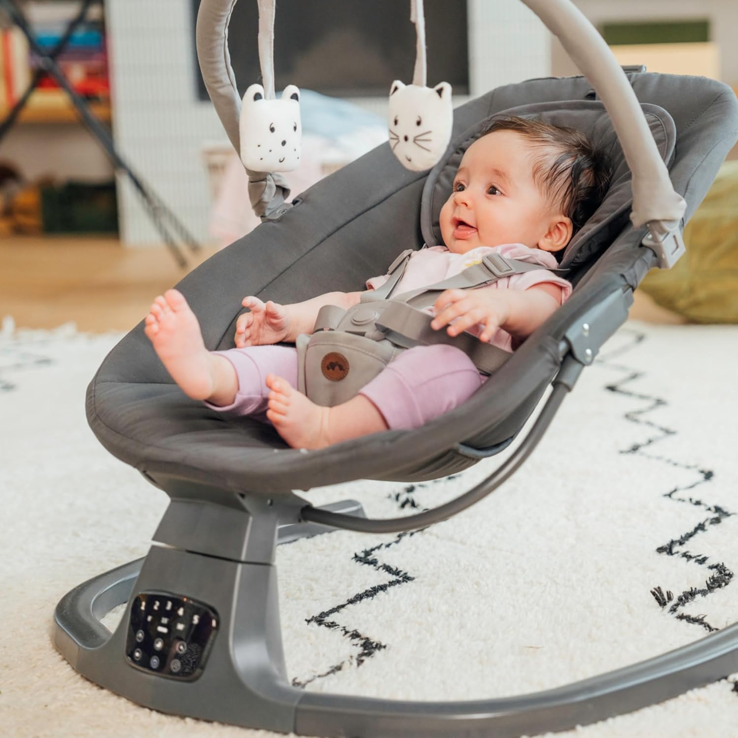 DÉTECTION AUTOMATIQUE DE MOUVEMENT : Jolana propose 5 vitesses de balancement pour soulager votre enfant et un mode stationnaire pour se détendre et faire une pause – Changez manuellement les réglages grâce à l’écran tactile situé à la base.