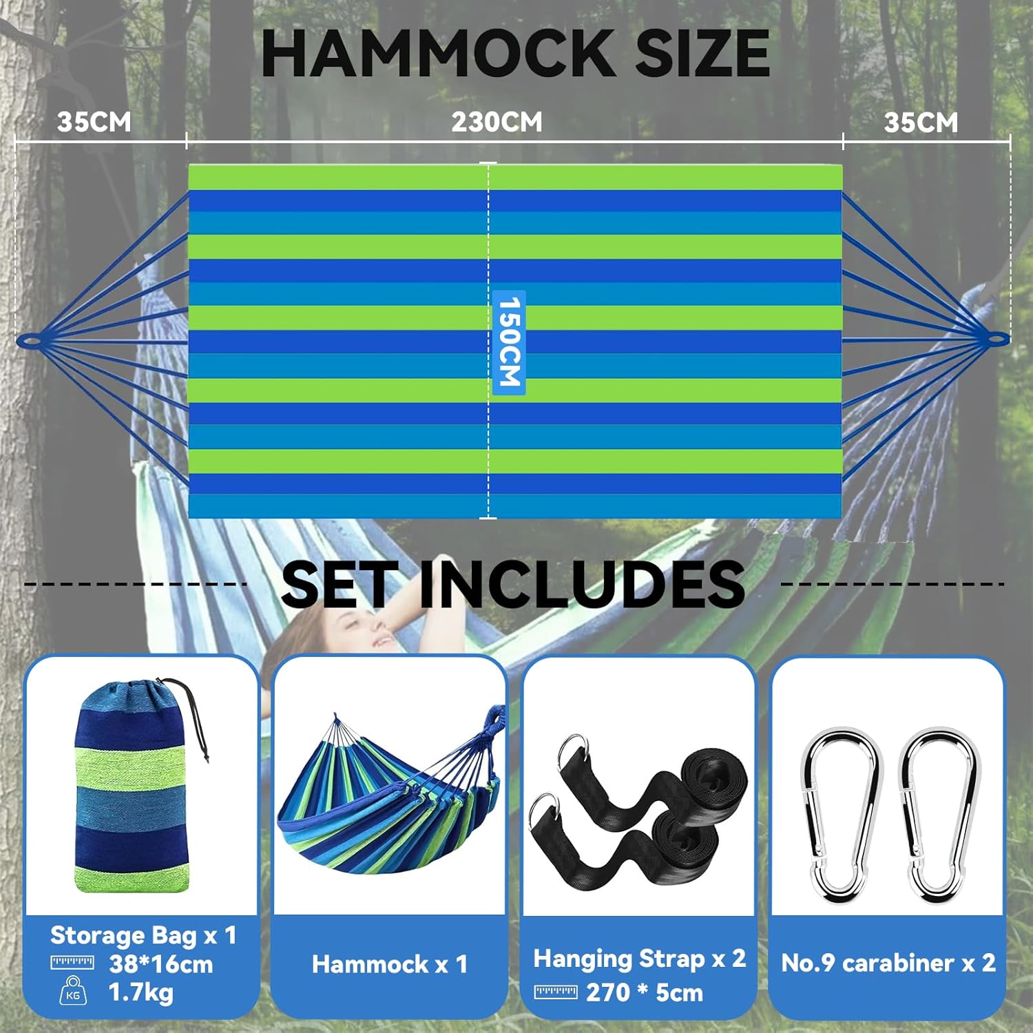 【Compact et portable】: Le hamac en toile portable est équipé d’un sac de rangement. Lorsqu’il n’est pas utilisé, conservez le hamac dans un sac de rangement respirant. Taille de pliage compacte en termes d’enveloppement, poids 1,7 kg( Inclut deux mousquetons en fer et des ceinture en nylon). Vous pouvez utiliser une machine à laver pour nettoyer le hamac pour empêcher le saleté et le mildiou.