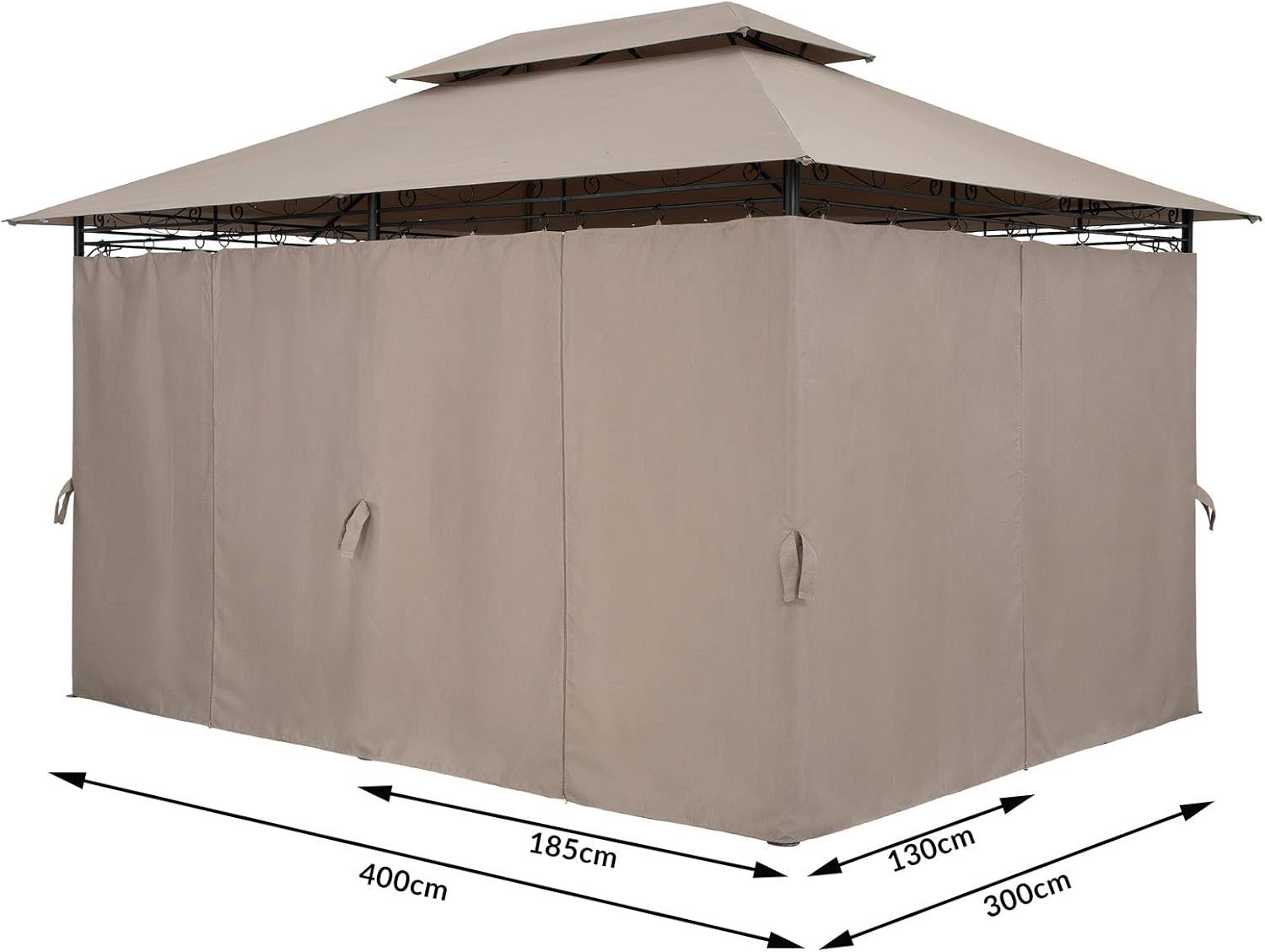CARACTÉRISTIQUES TECHNIQUES : Structure (montée) : 3 x 4 m // Hauteur de passage : 2,69 m // Matériau toile face extérieure : 100% Polyester // Matériau toile face intérieure : 100% Polyuréthane // CONTENU DE LA LIVRAISON : 1x Pavillon Topas – couleur taupe // 18x piquets de terre // Cordes de fixation // Sac d’accessoires // Matériel de montage