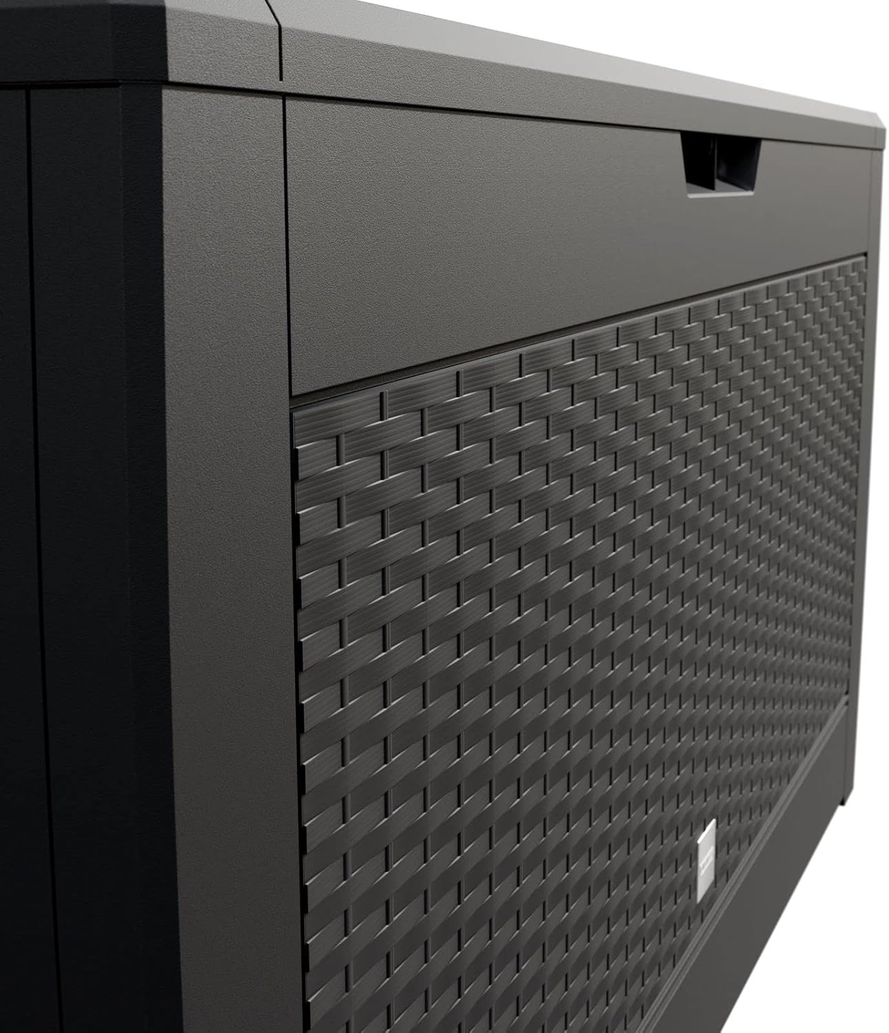 CARACTÉRISTIQUES TECHNIQUES : Capacité de 310 litres // Dimensions : 119 cm x 48 cm x 60 cm (LxlxH) // Modèle : Coffre de rangement aspect polyrotin anthracite