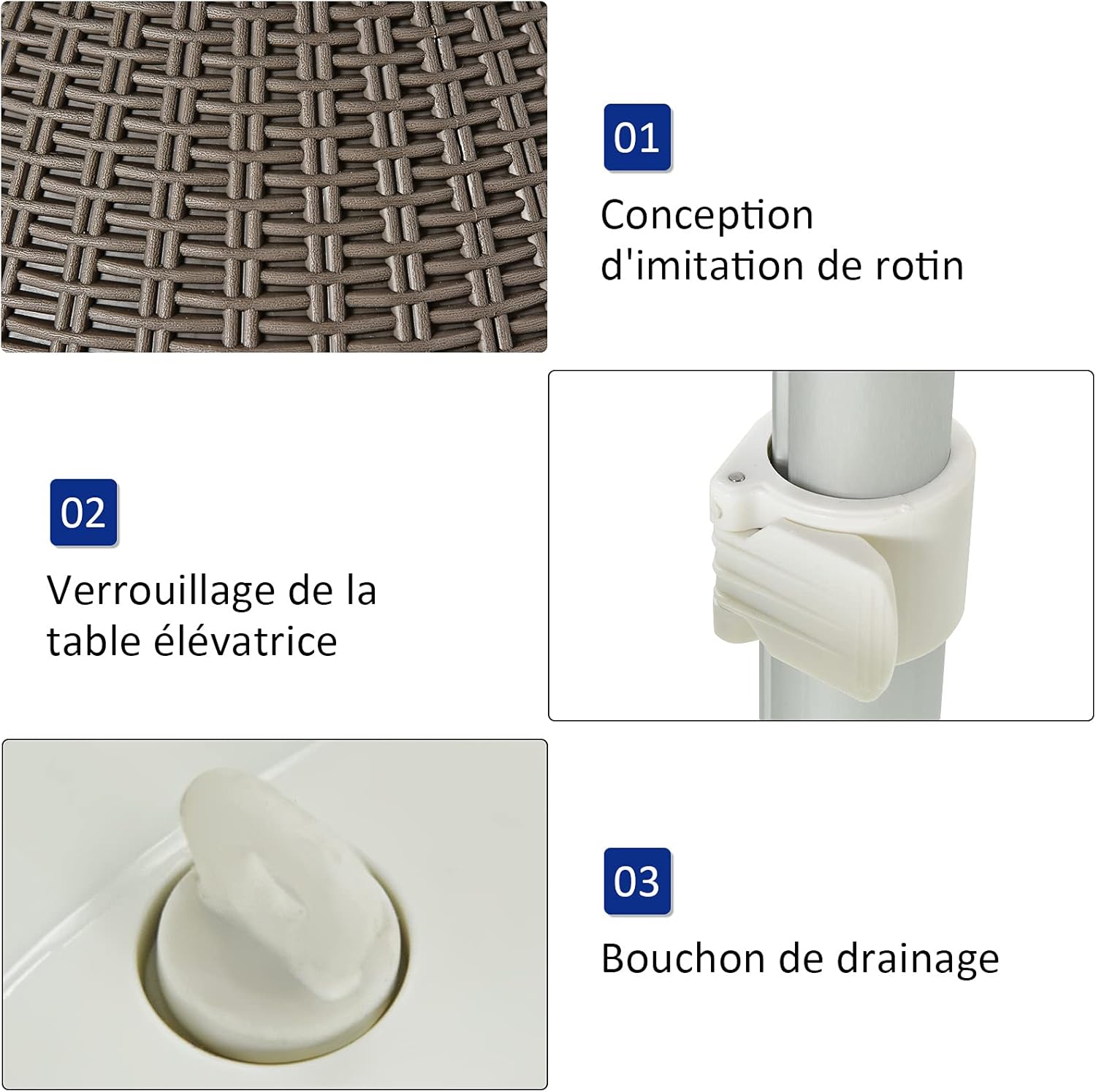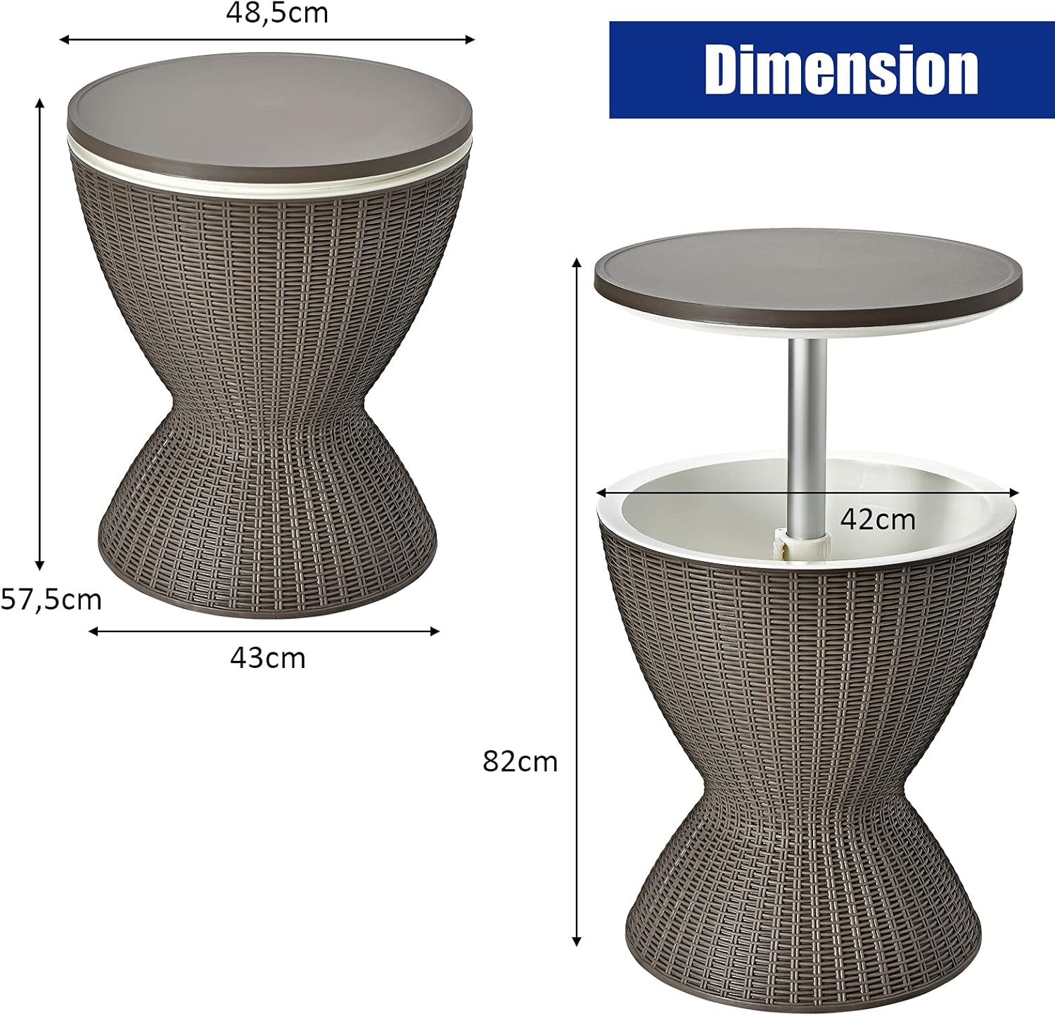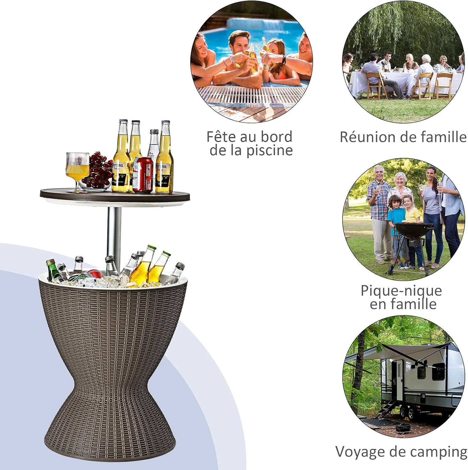 【Plateau extensible :】Le plateau relevable dispose de 2 hauteurs réglables de 57,5 cm ou 82 cm, qui se maintiennent de manière stable. En outre, le plateau, qui peut supporter jusqu’à 75 kg, permet de ranger ou de sortir vos boissons du seau à glace.
